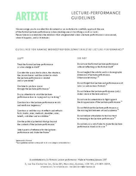 The arts-based research project Six Formats (February 2015 - June 2018) analysed various formats commonly used in relation to arts-based knowledge articulation and/or communication in the present day: publication, exhibition, symposium, lecture-performance, screening, and workshop. Six Formats created situations of dialogue in, on, and between each of its formats. Six Formats facilitated co-processes of ongoing self-reflection and re-articulation aiming for reciprocal attentiveness to the respective needs of the project, its partners, and co-researchers. Six Formats was funded by the Austrian Science Fund (FWF, PEEK, AR291-G21) and hosted by the Academy of Fine Arts Vienna.