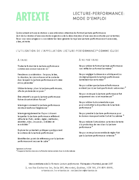 The arts-based research project Six Formats (February 2015 - June 2018) analysed various formats commonly used in relation to arts-based knowledge articulation and/or communication in the present day: publication, exhibition, symposium, lecture-performance, screening, and workshop. Six Formats created situations of dialogue in, on, and between each of its formats. Six Formats facilitated co-processes of ongoing self-reflection and re-articulation aiming for reciprocal attentiveness to the respective needs of the project, its partners, and co-researchers. Six Formats was funded by the Austrian Science Fund (FWF, PEEK, AR291-G21) and hosted by the Academy of Fine Arts Vienna.