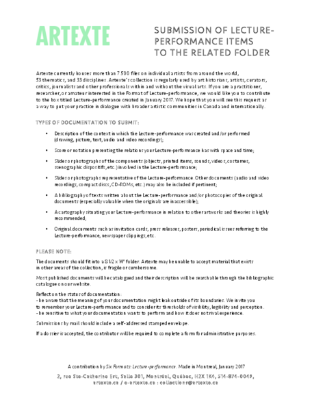 The arts-based research project Six Formats (February 2015 - June 2018) analysed various formats commonly used in relation to arts-based knowledge articulation and/or communication in the present day: publication, exhibition, symposium, lecture-performance, screening, and workshop. Six Formats created situations of dialogue in, on, and between each of its formats. Six Formats facilitated co-processes of ongoing self-reflection and re-articulation aiming for reciprocal attentiveness to the respective needs of the project, its partners, and co-researchers. Six Formats was funded by the Austrian Science Fund (FWF, PEEK, AR291-G21) and hosted by the Academy of Fine Arts Vienna.
