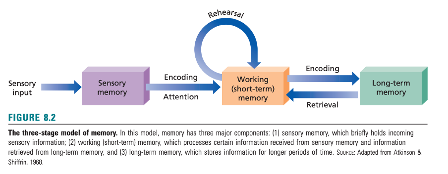 I psykologien kan hukommelse bli sett på som informasjonsprosessering. Etter at datamaskinene ble utbredt på 1960-tallet, samt en revolusjon innenfor kognisjon i psykologien, ble hukommelsesprosessen inndelt i tre deler: (på engelsk) Encoding, Storage og Retrieval.