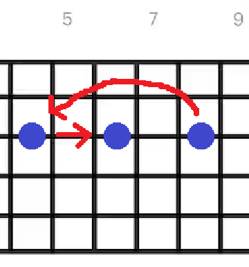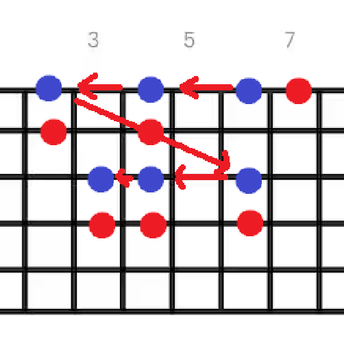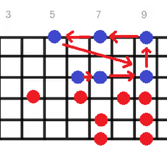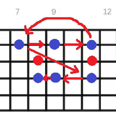 Innad i denne frasen, kan vi høre struktur 7. Dette er et eksempel på hvordan en struktur kan oppstå midt i en linje, med noter som kommer før og etter. For å lytte etter denne strukturen, har jeg vært oppmerksom på å gjenkjenne intervallene som oppstår når man hopper mellom strenger som denne strukturen byr seg ut på. (Strukturen er markert i blå, markert i rød er noter som spiller før og etter)