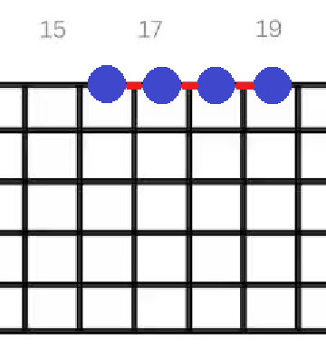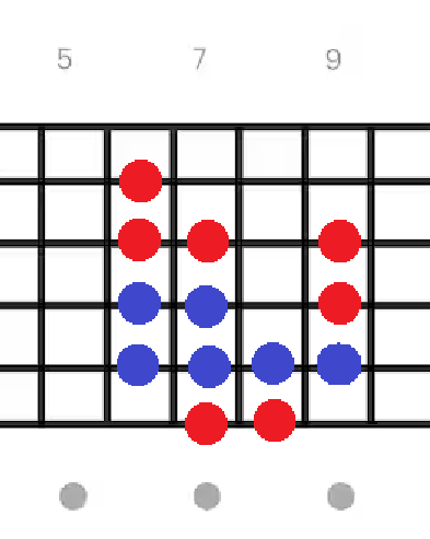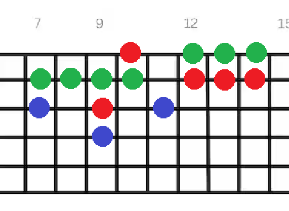 Her kan vi se bruk av både struktur 8, 2 og 3. Helt nederst på bildet til venstre ser vi to noter (rød), etterfulgt av struktur 8 på neste streng. Deretter forsetter struktur 8, men kuttes etter to noter på neste streng. Derav spilles skala videre oppover.