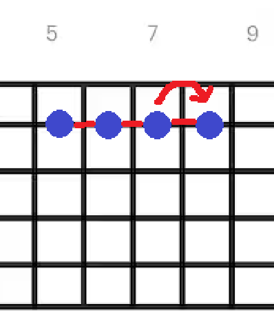 Innad i denne frasen, kan vi høre struktur 7. Dette er et eksempel på hvordan en struktur kan oppstå midt i en linje, med noter som kommer før og etter. For å lytte etter denne strukturen, har jeg vært oppmerksom på å gjenkjenne intervallene som oppstår når man hopper mellom strenger som denne strukturen byr seg ut på. (Strukturen er markert i blå, markert i rød er noter som spiller før og etter)