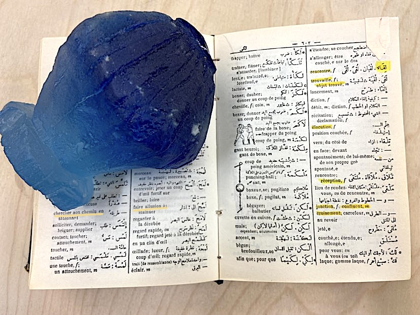 Rencontres et Répliques, détail, 2024. Dictionnaire de poche bilingue (ar-fr & fr-ar) et objet fabriqué en verre.