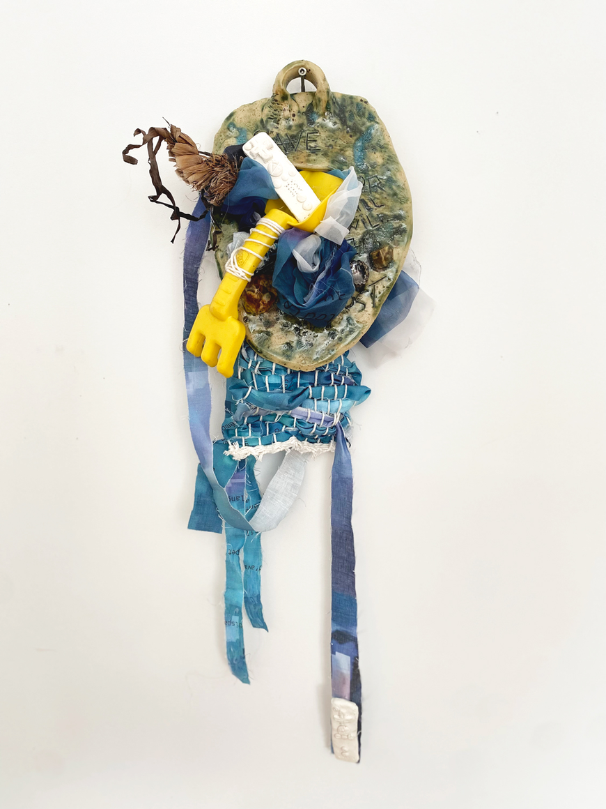 L’installation se présente comme un paysage fragmenté, un peu comme une plage après la tempête. Elle se compose de cinq sculptures, des formes étranges que j’ai construites en céramique et à partir de choses ramassées ici et là, surtout en Corse : coquillages, roches, vieux jouets, filets de pêche et autres trésors collectés. Ces matériaux, je ne les ai pas toujours choisis pour leur beauté, mais pour l’histoire qu’ils portent en eux. Pour accentuer cette idée de transformation, j’ai plongé certaines pièces dans une solution saline. Le sel se dépose lentement, il craquelle, il change tout. Ces sculptures sont en perpétuelle évolution. Elles vivent, elles respirent, elles se défont parfois sous mes yeux.