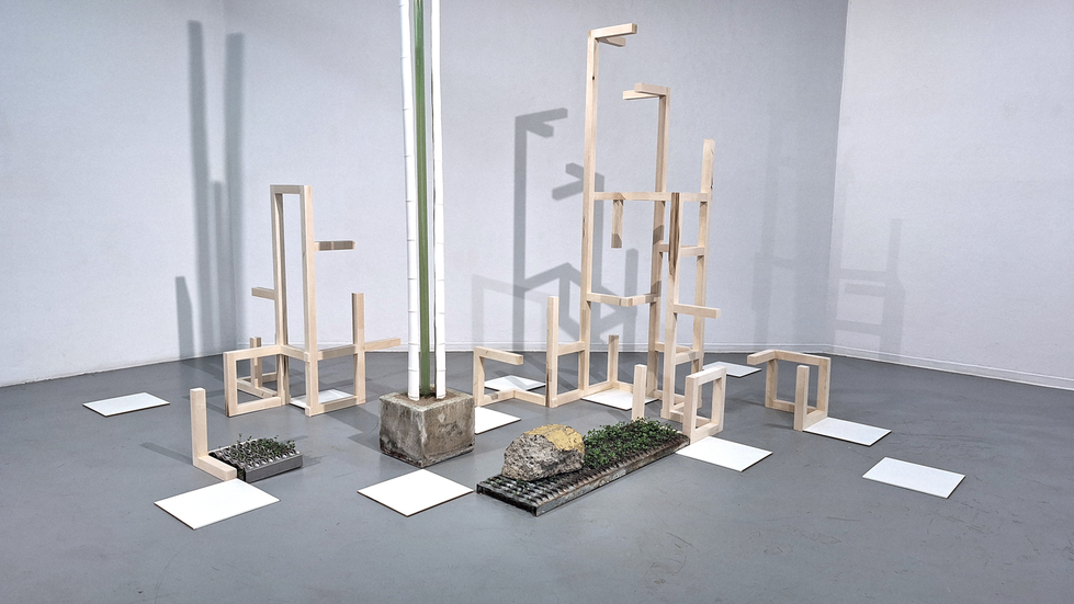 Pour « les lignes de solitude », à travers un prisme post-minimalisme, c’est une installation de type tsubo-niwa qui aura été explorée à travers une déconstruction et reconstruction de ses archétypes, par la céramique et le bois, tout en travaillant l’espace négatif et l’ombre comme élément matériel. L’aspect wabi-sabi, aura été également exploré via la présence et l’agencement d’artefacts urbains en tension avec la présence de semences et chlorophylle, insufflant ainsi une dimension écosophique.