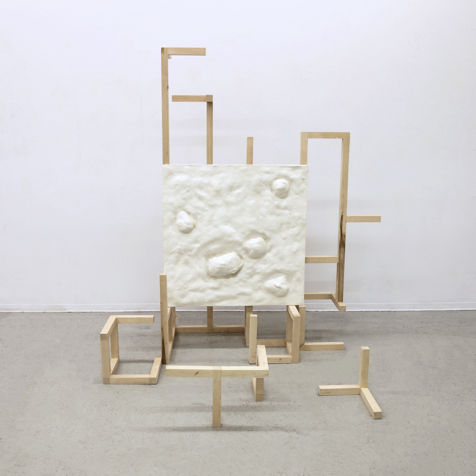 Enfin, via le prototype d’atelier « il n’y a plus de saisons… », il s’agit cette fois d’explorer les avenues des possibles entre la conjonction du kare-sansui et du tsubo-niwa dans une optique post-minimaliste se déclinant autant comme tableau-objet que sculptures installatives. Mais cette fois, c’est dans une incarnation organique de la matière que se manifestent des empreintes dans l’argile selon un rituel processuel, similaire à l’érosion, et laissant un paysage métaphorique desséché et dénué de toute saison. Façonnées en négatif puis moulées en plâtre, éventuellement brisées et fragmentées, ces empreintes hétérotopiques deviennent fragments de territoires et de jardins, souvenir ou prémonition d’un espace spéculatif au sein d’un rhizome de bois en plaine d’Ambrosia ; essence infectée par des coléoptères d’Ambroisie, laissant ainsi trous et décolorations suite aux champignons s’y engouffrant, et analogie aux ressacs du temps.
