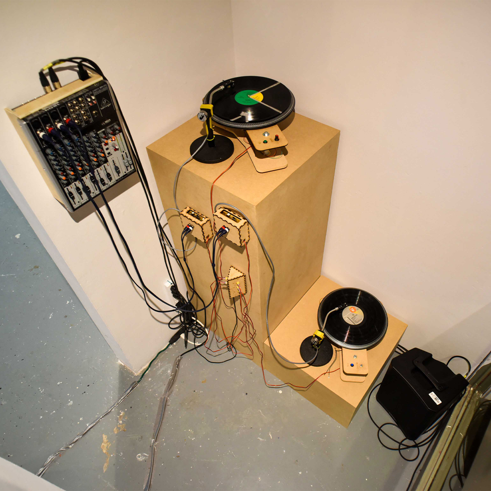 Deux œuvres issues de cette recherche seront présentées au FIMAV 2025, dans le cadre du parcours d’installations sonores en ville. La première, installée dans un conteneur de trois mètres par trois, est une sorte de boîte sonore ouverte sur la rue. À l’intérieur, trois modules DIY, chacun composé d’une platine artisanale et d’un disque en verre. Chaque module diffuse une plage de fréquence distincte : graves, médiums, aigus. Le tout tourne à des vitesses différentes, sans boucle fixe, dans une forme de lente dérive. Ce n’est pas une pièce spectaculaire. Plutôt une respiration étirée. Quelque chose qui happe si on prend le temps d’écouter.
