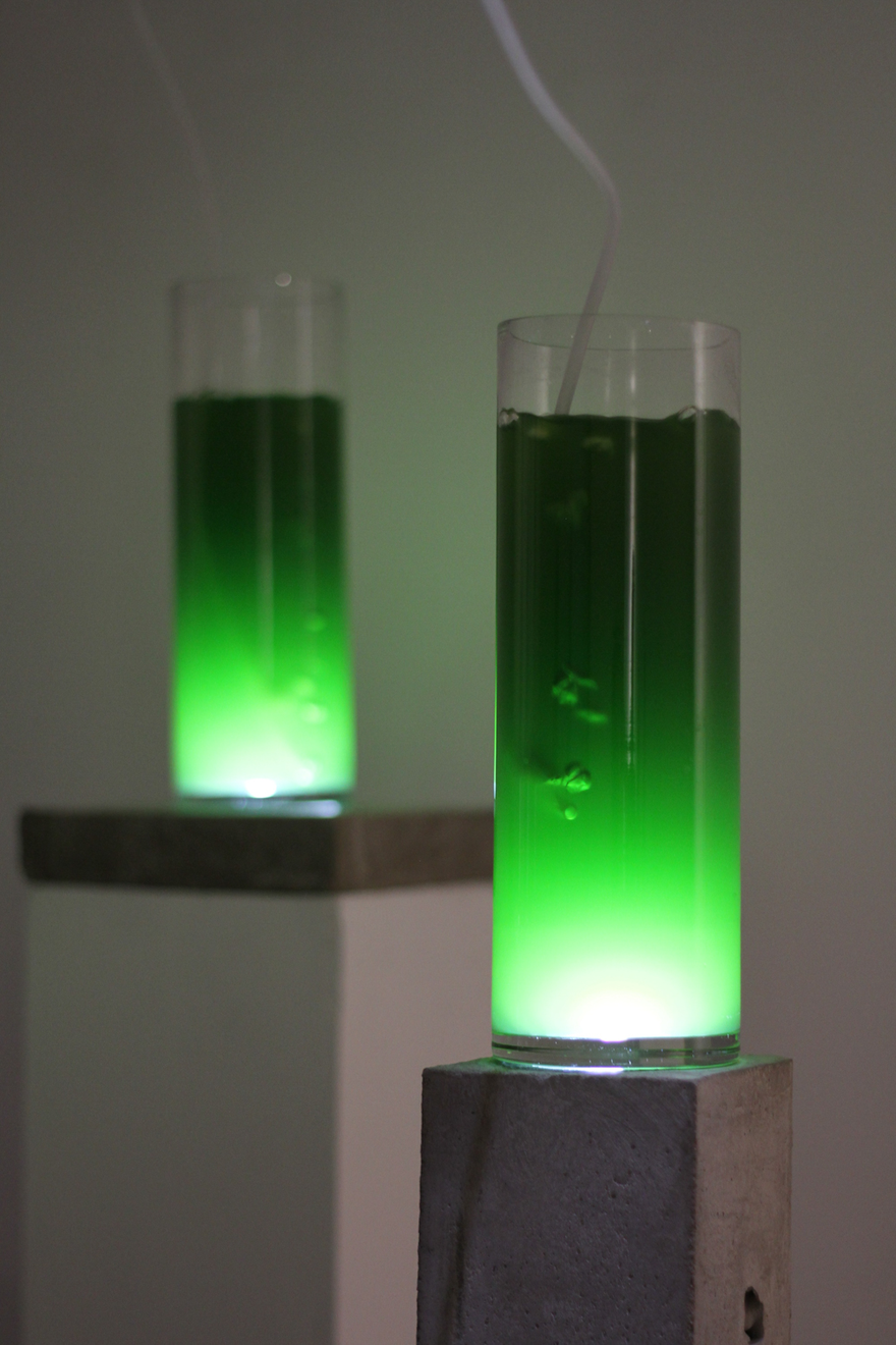 L’installation Prolifération d’imaginaires dystrophiques se déploie donc à travers quatre dispositifs interconnectés par la photosynthèse. Chacun explore un aspect des relations entre matière, énergie et vivant, tout en permettant la réalisation d’impressions au phytoplancton. Ces structures, faites de matériaux bruts aux formes organiques, mettent en valeur la chlorophylle : pigment vert central de la vie végétale. Dans son essai The Colour Green (2018), Prudence Gibson décrit le vert comme un outil à la fois esthétique, culturel et politique. J’ajouterais qu’ici, le vert dépasse la fonction esthétique : il n’est pas qu’un pigment, mais une technologie permettant un processus vital. Il agit comme un capteur de lumière essentiel à la photosynthèse, devenant bioindicateur de l’état de santé et de stress du végétal. Ainsi, les impressions résultantes deviennent des archives éphémères de ces interactions entre le végétal et son environnement. Celles-ci ne sont pas simplement représentatives d’un objet ou d’une idée, mais sont quelque chose en soi, comme l’écrit la chercheuse Jane Vuorinen dans son ouvrage Photographic Art with Light, Chlorophyll, Yeasts, and Bacteria (2023).