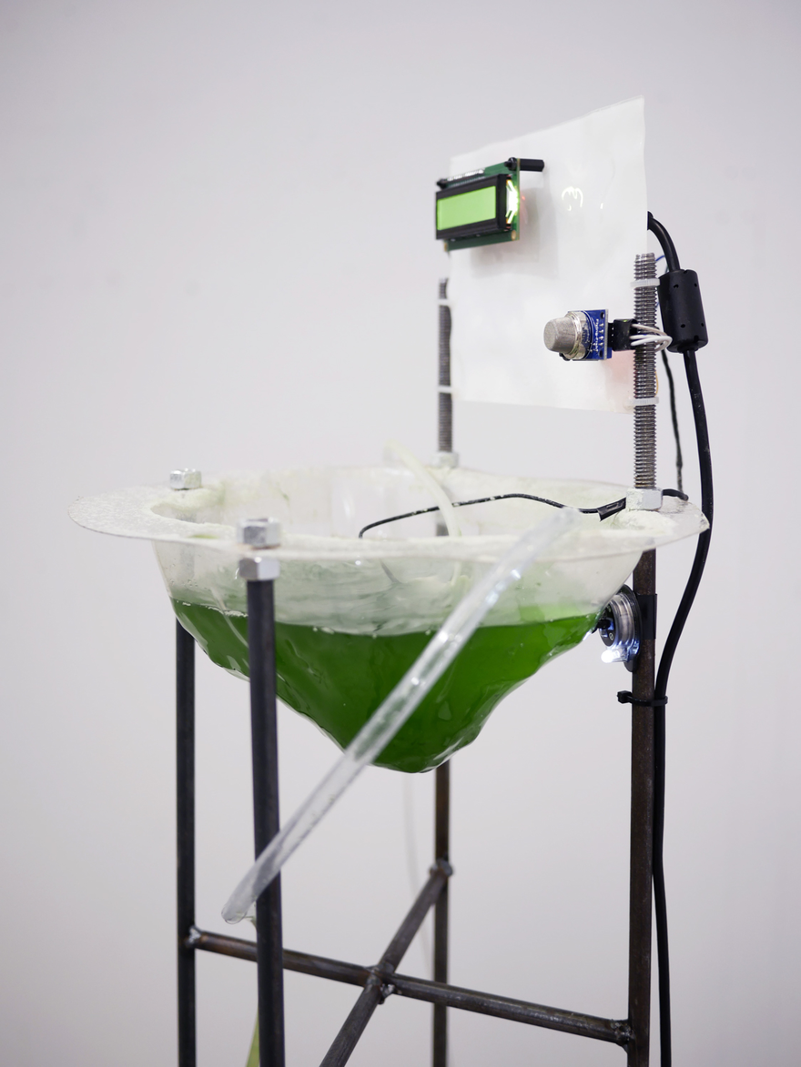 Prolifération d’imaginaires dystrophiques est un écosystème aqueux composé d’organismes photosynthétiques et de dispositifs électroniques interconnectés, tissant un réseau vivant au cœur de la galerie. Cette installation, à la croisée de l’art et de la science, explore les relations potentielles entre le monde végétal et les technologies numériques. Une hybridation que Roy Ascott qualifie de « moist media » : un substrat créatif où se rencontrent systèmes informatiques secs et systèmes biologiques humides. Dans mon projet de recherche-création, cette interconnexion repose sur le phénomène d’eutrophie ainsi que sur le potentiel créatif de la photosynthèse, notamment à travers la photographie à la chlorophylle. C’est dans ce cadre que j’explore les biomatériaux et les biotechnologies artisanales : des techniques ou des savoir-faire qui incorporent le vivant selon une approche low-tech, expérimentale, et accessible.