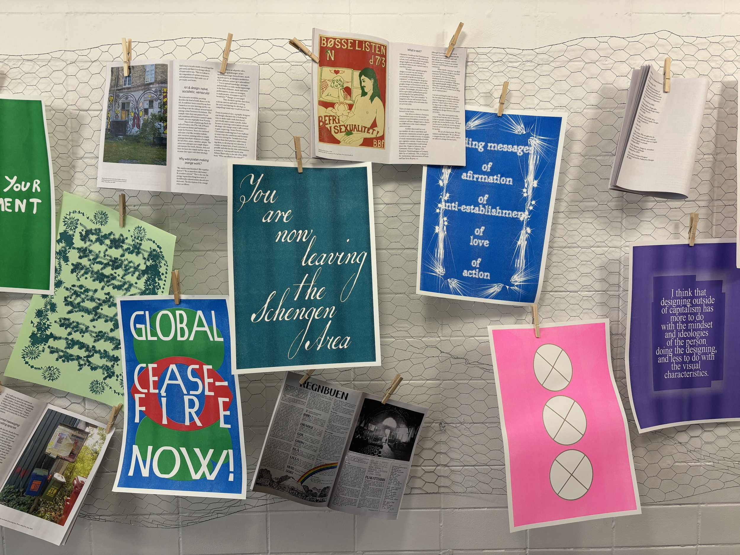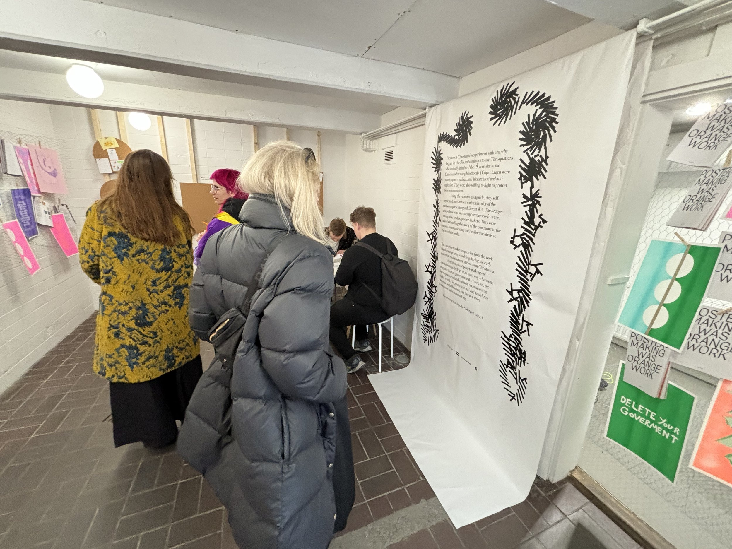 The ideas behind looking to graphic design in an anarchist commune sprang up from the influx of publications about the connections between design and capitalism. Books like Design after Capitalism, (Wizinsky, 2022), CAPS LOCK (Pater, 2021), Who Can Afford To Be Critical (Lorusso, 2022) inspired me to consider what graphic design looks like when it is created within a non-Capitalistic environment. Orange Work is then a survey of the recent history of intentionally non- or anti-Capitalistic graphic design, in the Nordic context. It includes a participatory element wherein guests are invited to contribute to the conversation.