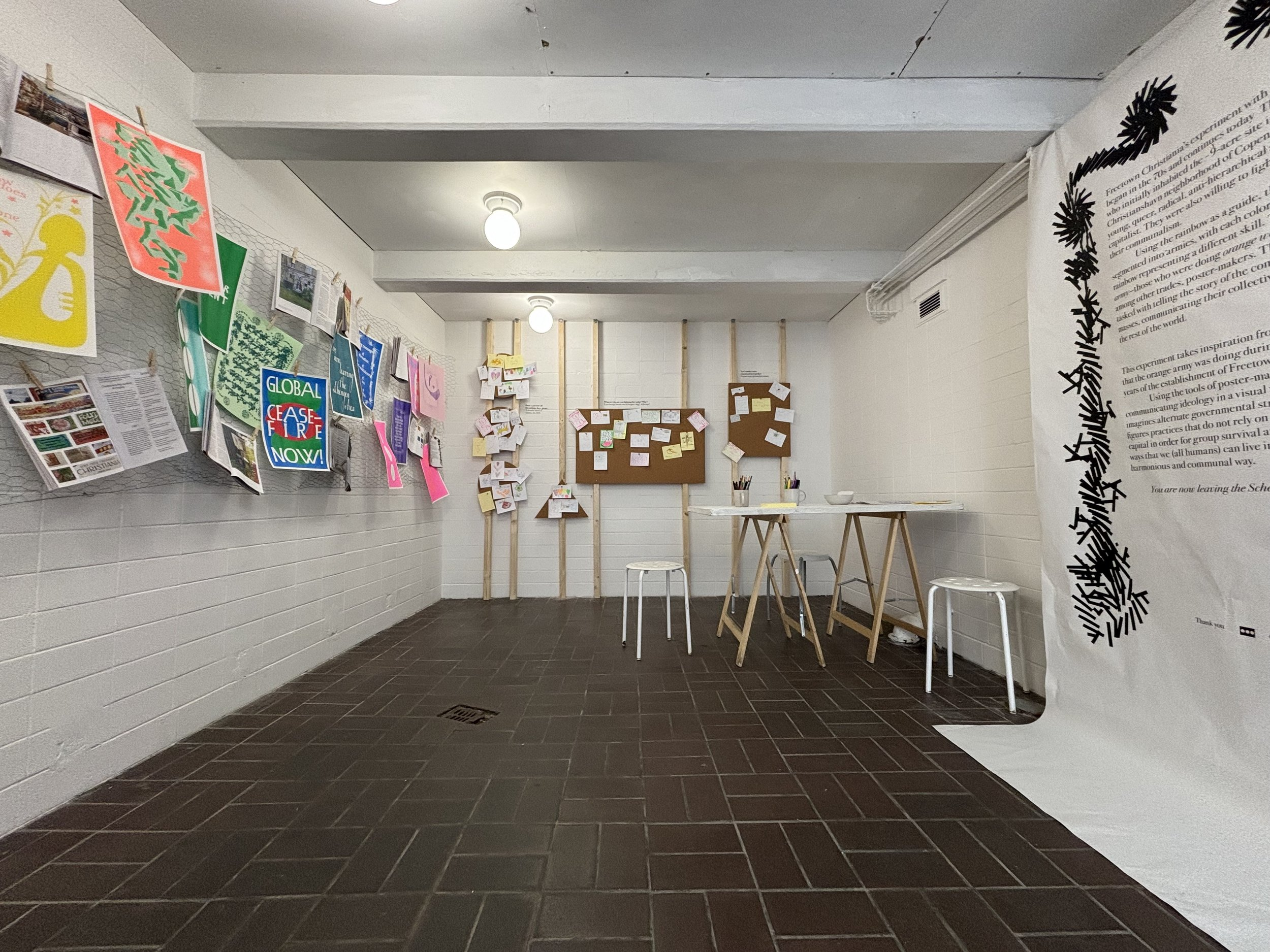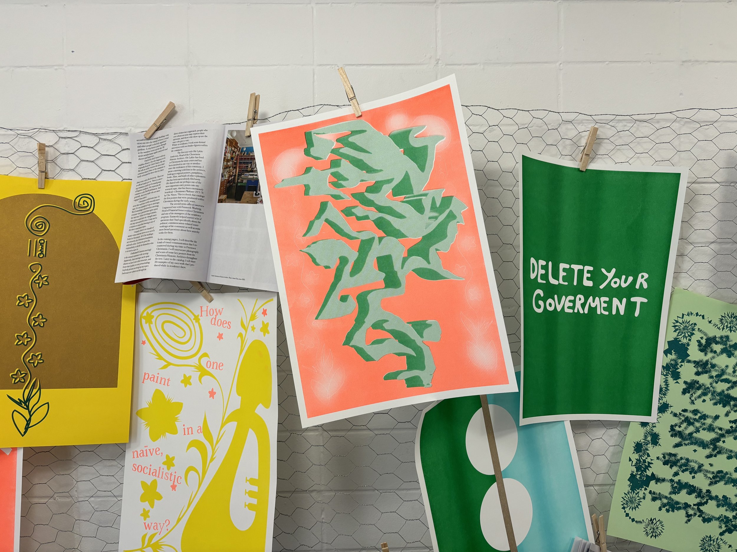 Using the tools of poster-making—of communicating ideology in a visual way—this work imagines alternate governmental structures, prefigures practices that do not rely on ammassing capital in order for group survival and visualizes ways that we (all humans) can live in a more harmonious and communal way.