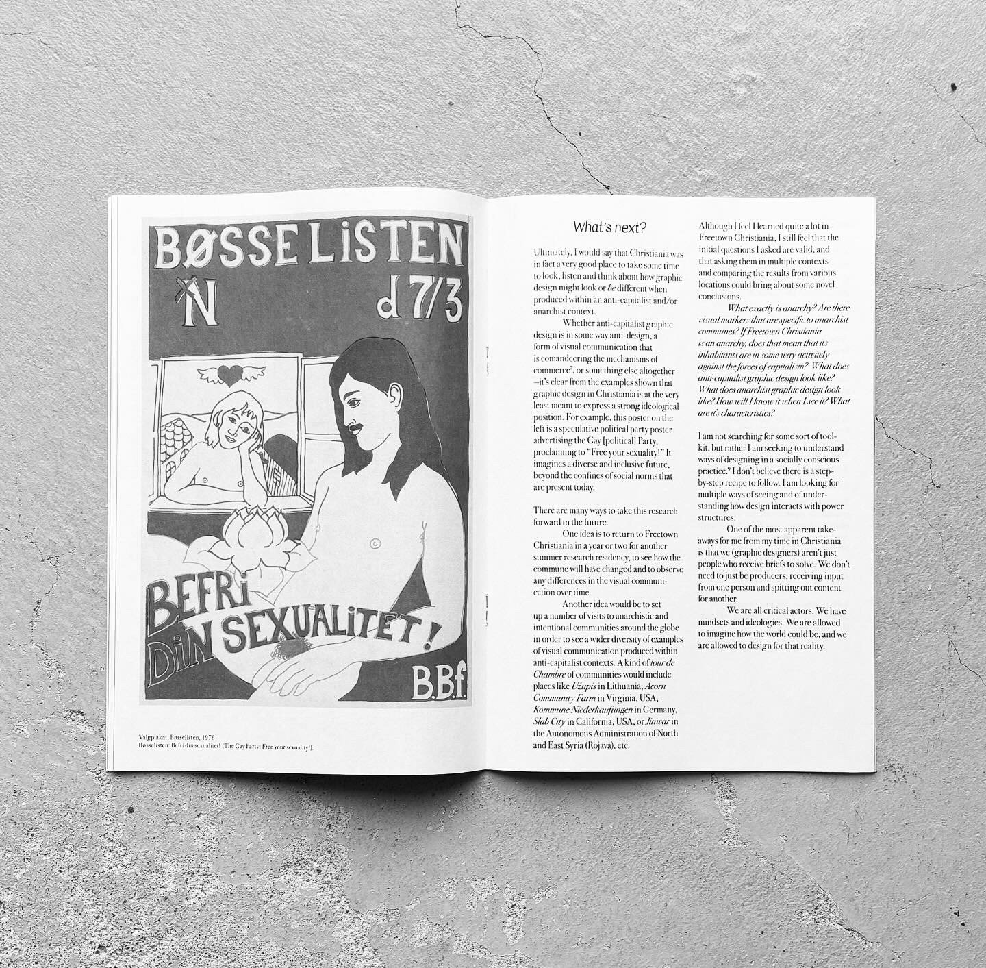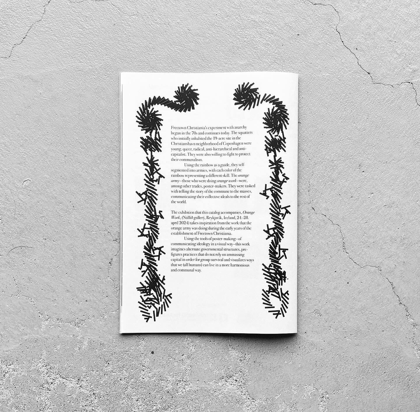 Poster-making was orange work is the exhibition catalog which includes an essay and reproductions of posters from the Orange Work. The essay was written during a month-long residency in Freetown Christiania during June 2023. It brings together observations, photographs, and drawings created while in residence. It synthesizes conversations with people who live in this anarchist commune as well as visits to the Christiania Historic Archives to view posters and other printed materials from the 70s until today. It is therefore a kind of a survey of the recent history of intentionally non- or anti-Capitalistic graphic design, in the Nordic context.