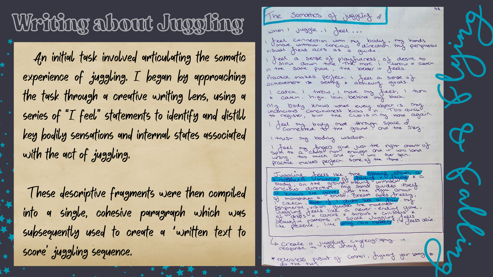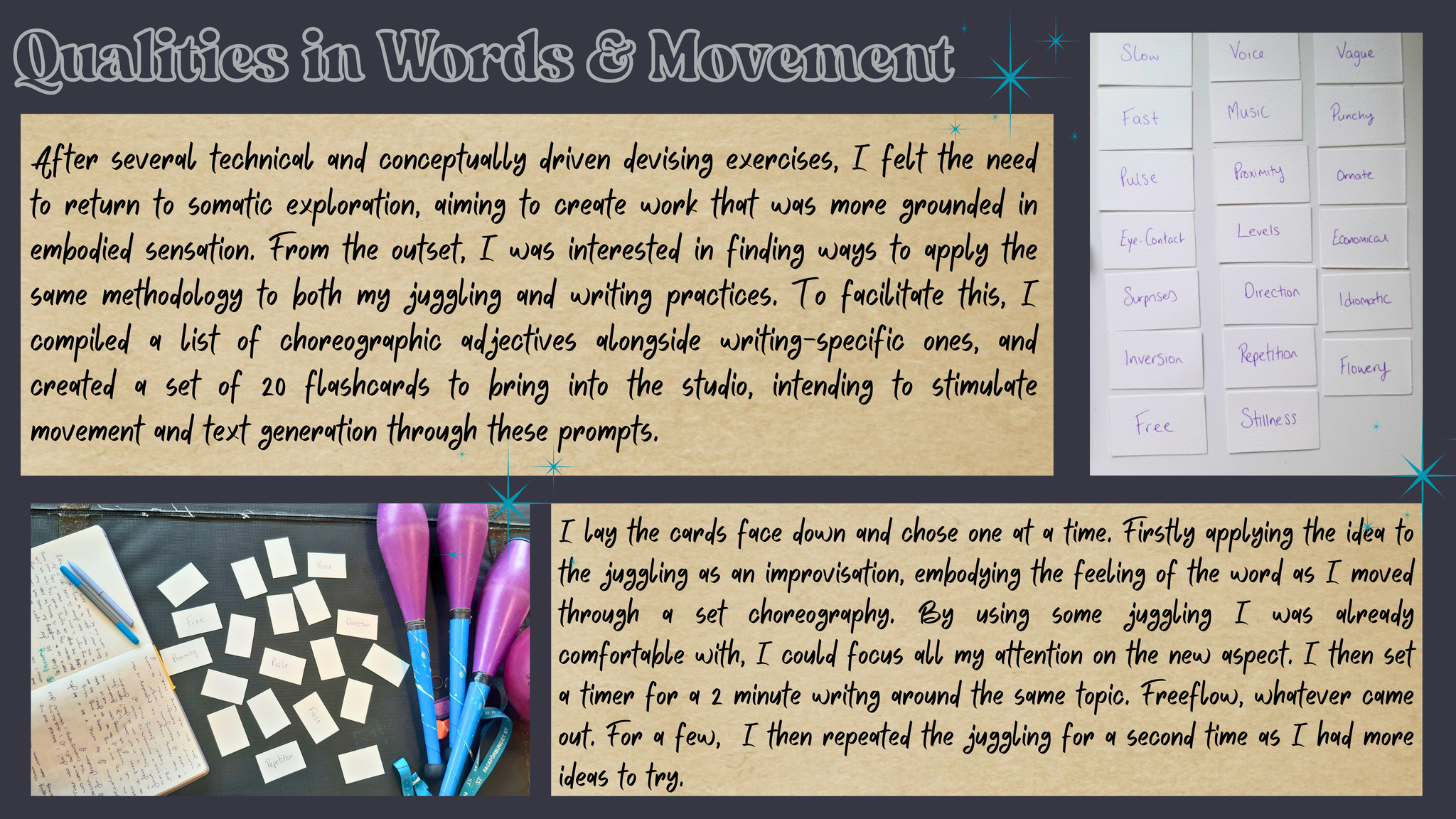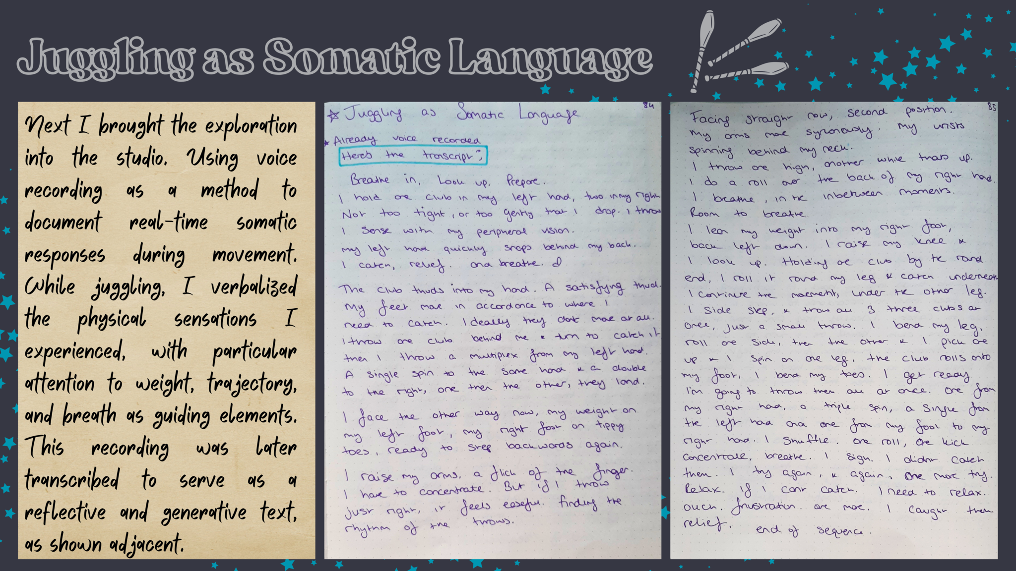 How can we juggle semiotics and write somatics in circus? I aim to investigate the relationship between two artistic practices Juggling & Writing, how they can intersect and how the material can create emotive and exciting physical storytelling. As juggling is an inherently somatic practice and writing & words naturally hold semiotic value, the question aims to contradict the dualistic terms. This project is a new development of a previous research into circus directing methodologies. However this will focus on my personal practices and the connection between juggling and creative writing; storytelling methodologies within a circus and theatre context. In previous work I have integrated these to a certain extent and now I would like to research devising techniques to find new ways of working. Can I juggle words? Can my writing hold rhythm, can it drop, catch, use siteswap theory?