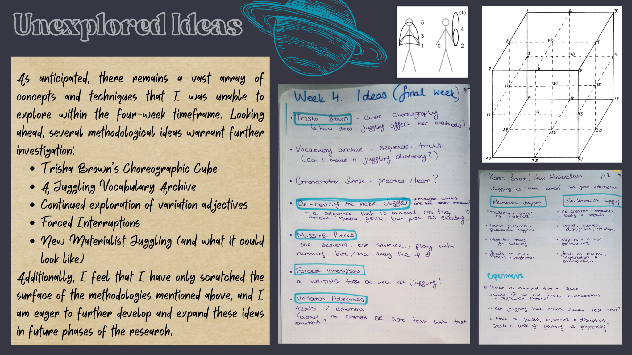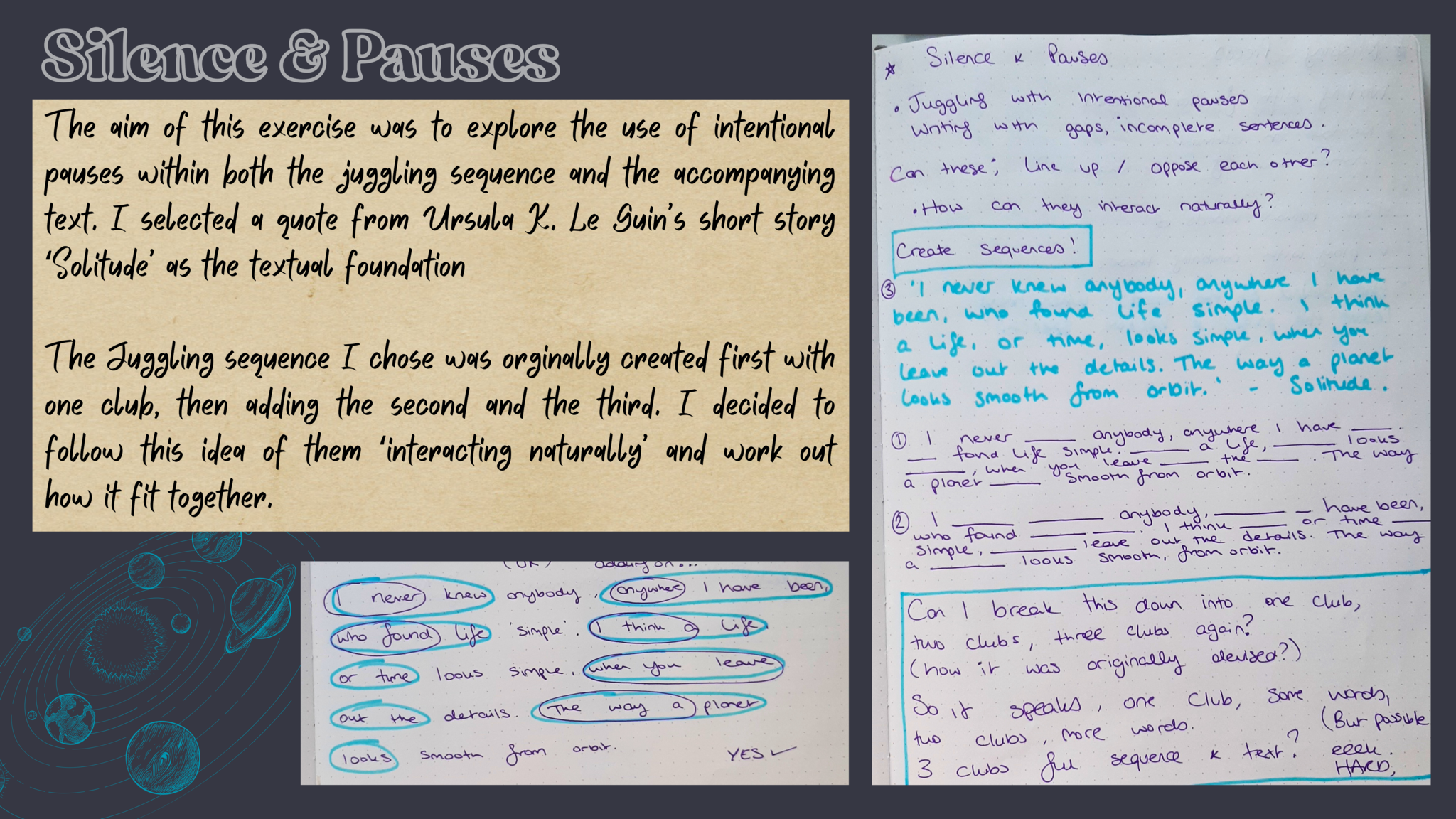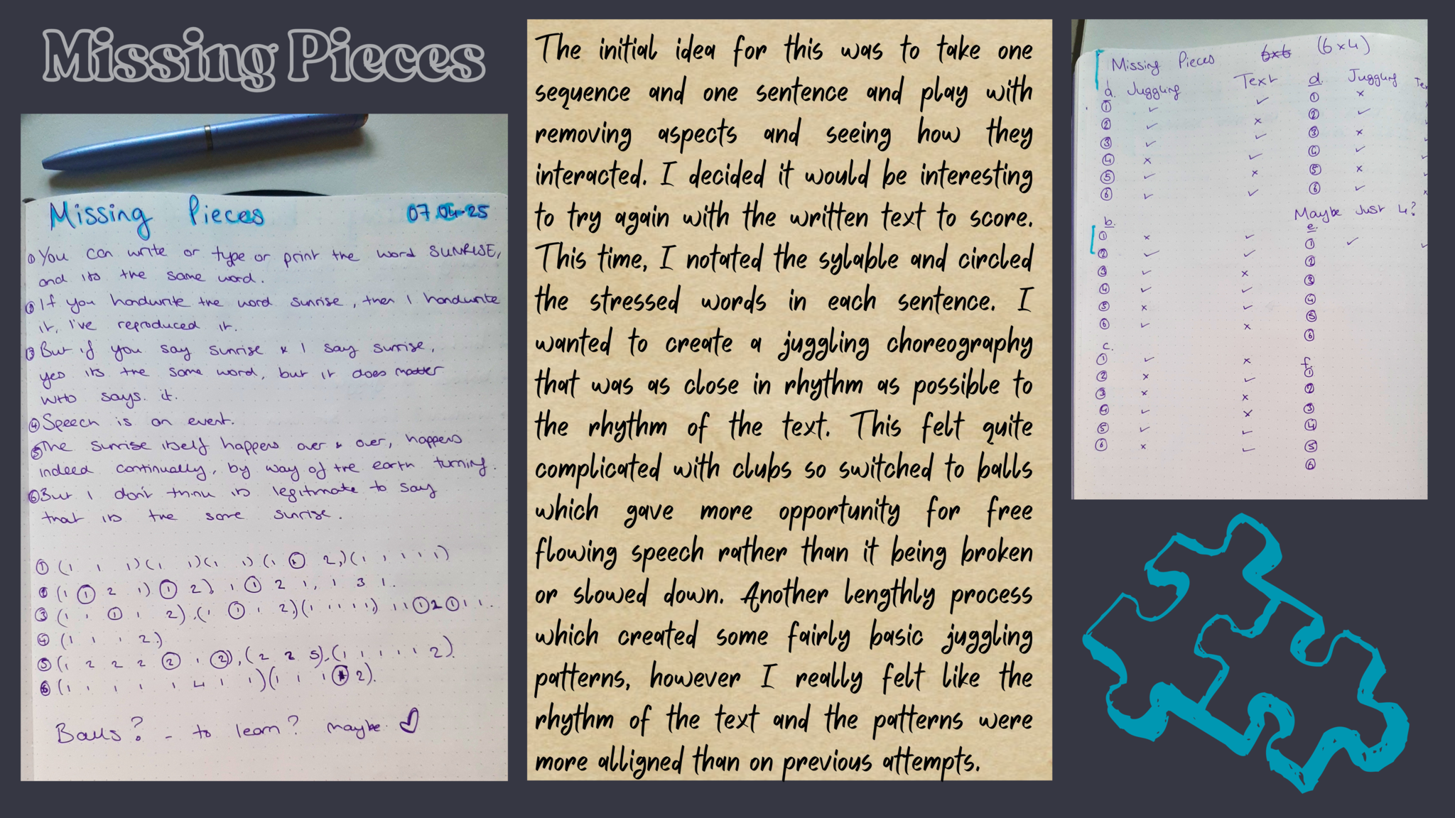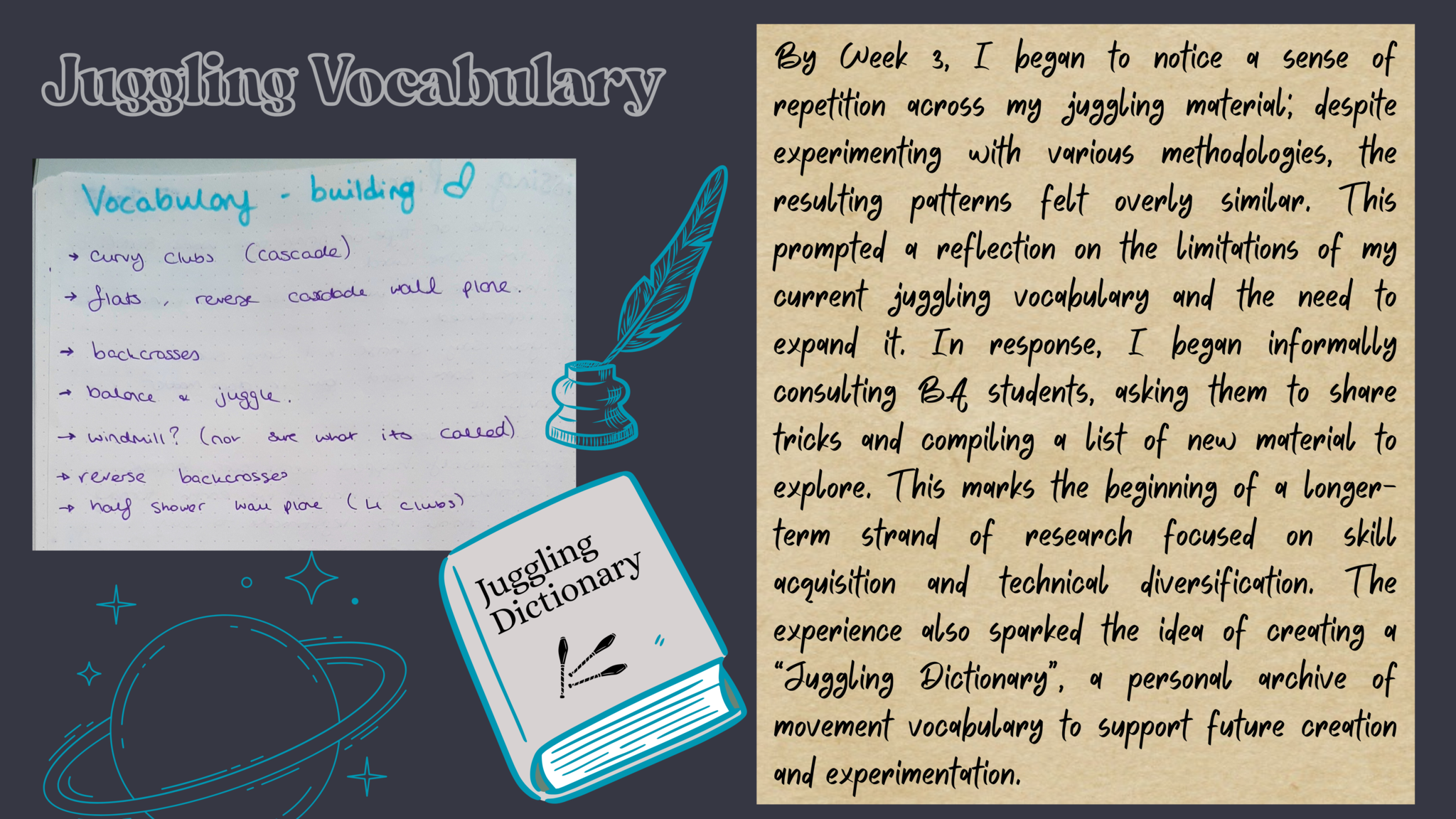 How can we juggle semiotics and write somatics in circus? I aim to investigate the relationship between two artistic practices Juggling & Writing, how they can intersect and how the material can create emotive and exciting physical storytelling. As juggling is an inherently somatic practice and writing & words naturally hold semiotic value, the question aims to contradict the dualistic terms. This project is a new development of a previous research into circus directing methodologies. However this will focus on my personal practices and the connection between juggling and creative writing; storytelling methodologies within a circus and theatre context. In previous work I have integrated these to a certain extent and now I would like to research devising techniques to find new ways of working. Can I juggle words? Can my writing hold rhythm, can it drop, catch, use siteswap theory?
