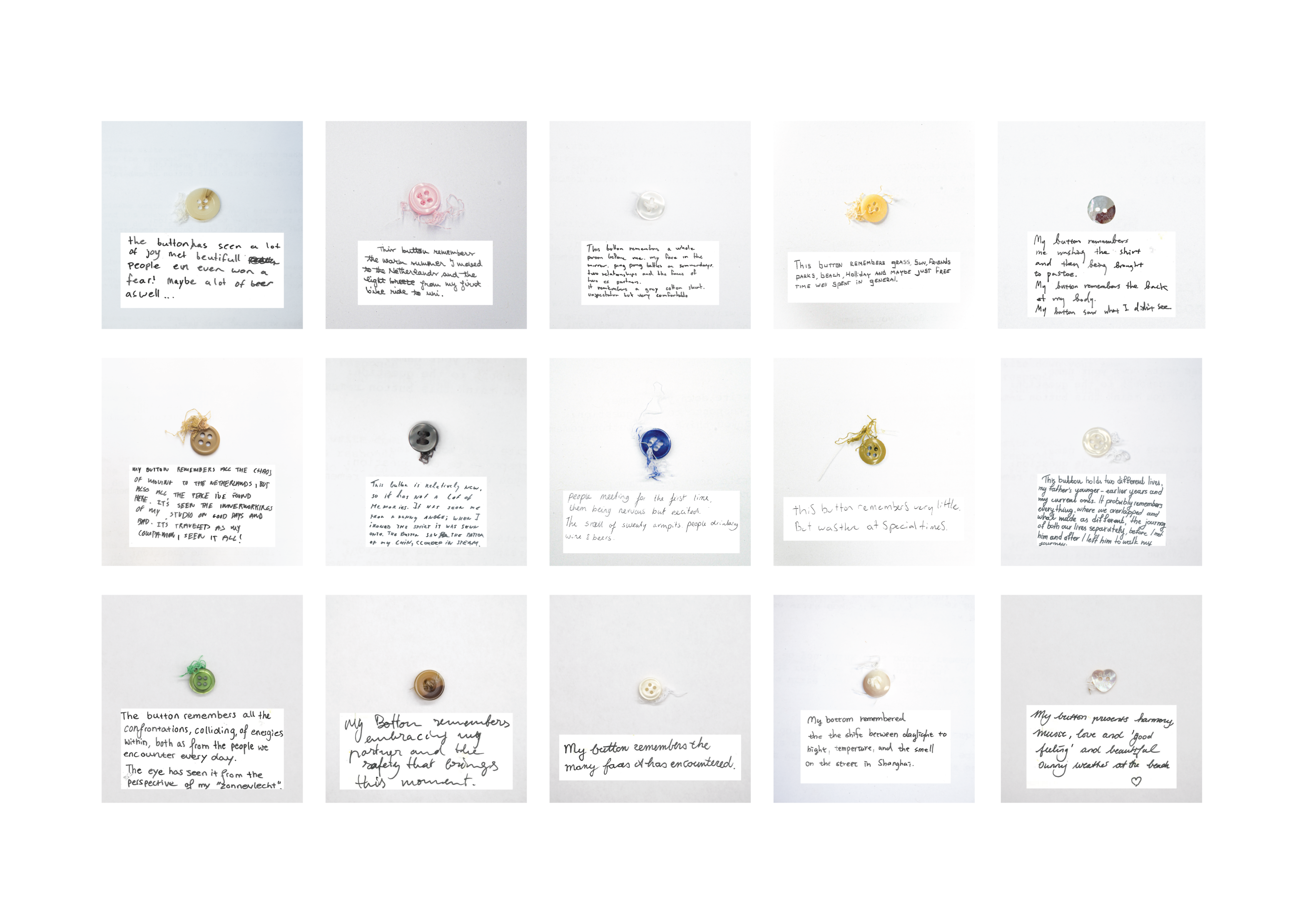 (i.)“My button remembers a whole person before me. My face in the mirror, pingpong battles on summerdays, two relationships, and the faces of two ex-partners. It has remembered a grey cotton shirt, unspecular but very comfortable.”