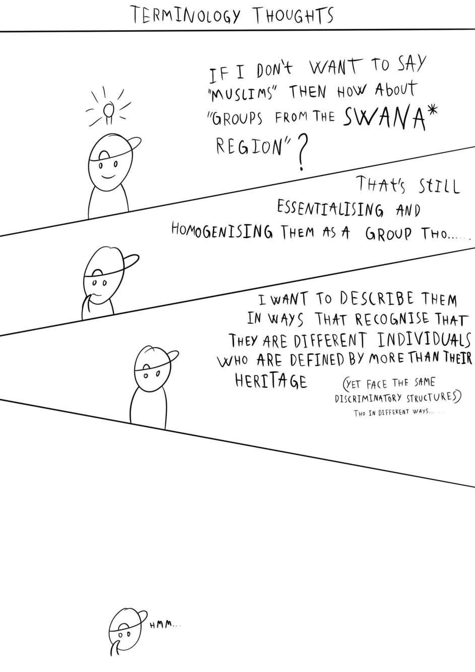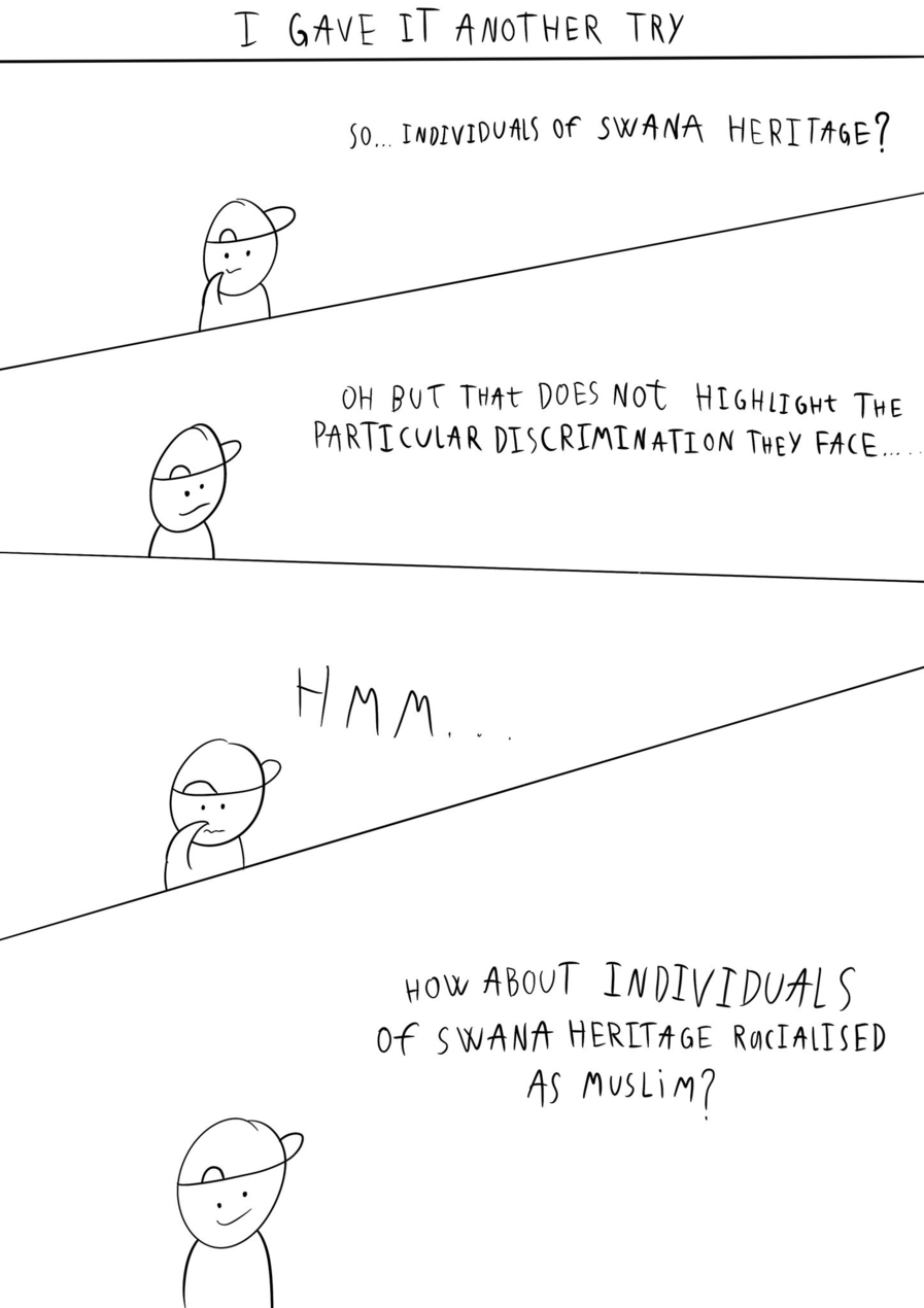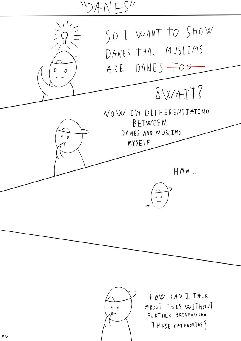 Through layers of legislation, political movements, wars, key events, and shifting migration patterns, my map uncovers how ‘the immigrant’ became synonymous with ‘the Muslim’ in Danish politics starting from the 1960s—tracing the contours of exclusion as they were drawn, redrawn, and hardened over time. To the right, it is traced how the anti-Muslim discourse paved the way for the legitimisation of demolishing multiple racialised neighbourhoods across Denmark and thereby displacing large groups of racialised individuals. The cartoons work to show questions, discomforts, and realisations that emerged as I confronted urban racism in Denmark through a white lens.