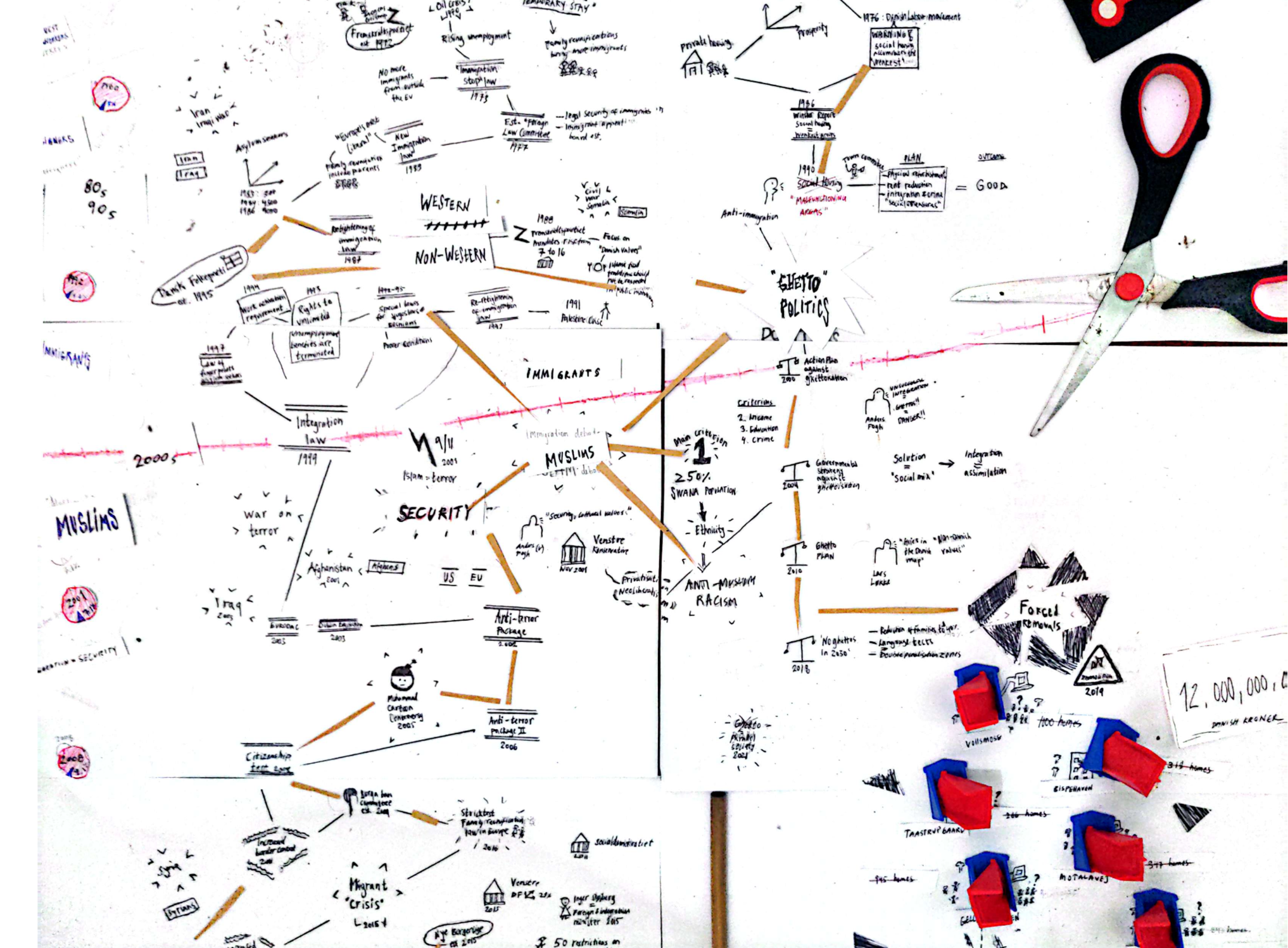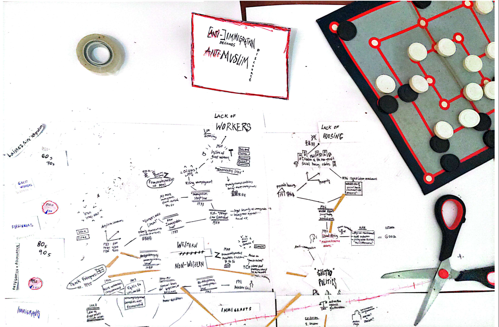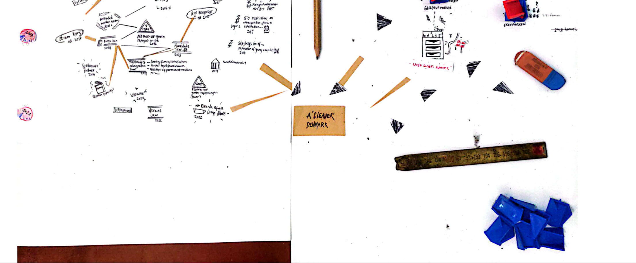Through layers of legislation, political movements, wars, key events, and shifting migration patterns, my map uncovers how ‘the immigrant’ became synonymous with ‘the Muslim’ in Danish politics starting from the 1960s—tracing the contours of exclusion as they were drawn, redrawn, and hardened over time. To the right, it is traced how the anti-Muslim discourse paved the way for the legitimisation of demolishing multiple racialised neighbourhoods across Denmark and thereby displacing large groups of racialised individuals. The cartoons work to show questions, discomforts, and realisations that emerged as I confronted urban racism in Denmark through a white lens.