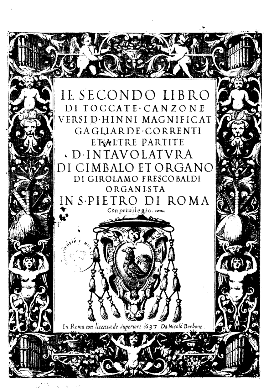The Nova Instructio consists of four engraved volumes: the first two were printed in Bamberg in 1670 and 1671 by J.J. Immel and J.G. Seyfert, whereas the last two parts, edited in Würzburg by J. Sallver a few years later (1676-77), are now lost. An entire manuscript copy of the four bands survives however in the Sächsische Landesbibliothek of Dresda (MB 4 f217)9. The rich frontispiece of the first band (see fig. 1) strongly resembles to the one of Frescobaldi’s Secondo Libro di Toccate, engraved by Nicolò Borbone in Rome about thirty years earlier (see fig. 2). This first allusion to Frescobaldi’s engraved publications gives a foretaste of the contents of the work, wherein the figure of the “monster of organists” (as Luigi Battiferri used to call him10) is omnipresent. The complete title appears as follows: