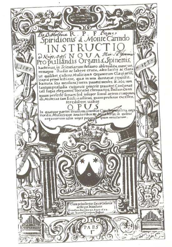 “ SPIRIDION a Monte Carmelo / New and hitherto unknown instruction / How one may not only completely attain in a short time, consummate skill in organ and keyboard-playing but also in the art of composition; thus easy and clear, so that whoever understands music and the keyboard and comprends well the first lesson (which can be grasped in only a measure or battuta) can thereafter by himself play diverse preludes, canzonas or fugues, toccatas, and thorough-bass in a few months without any difficulty, and can fully master and practice the art of composition / Divided in Four Parts / Highly necessary to all choirmasters, organists, and lovers of music, as well as monasteries which use the organ. / First Part Bamberg / Printed in the princely press by Johann Jacob Immel / In the year 1670.11”
