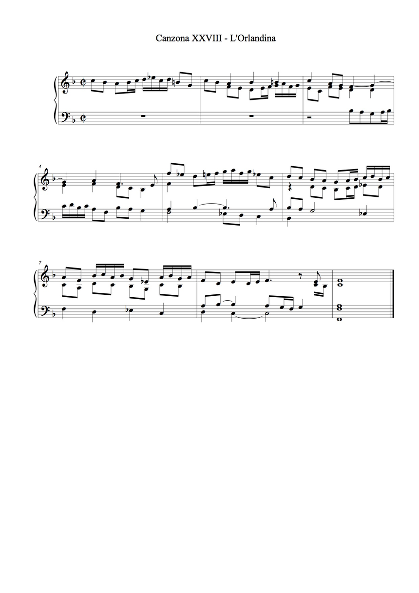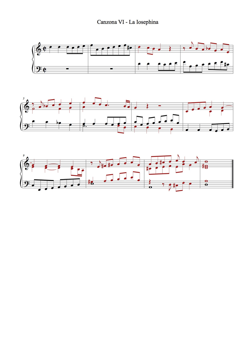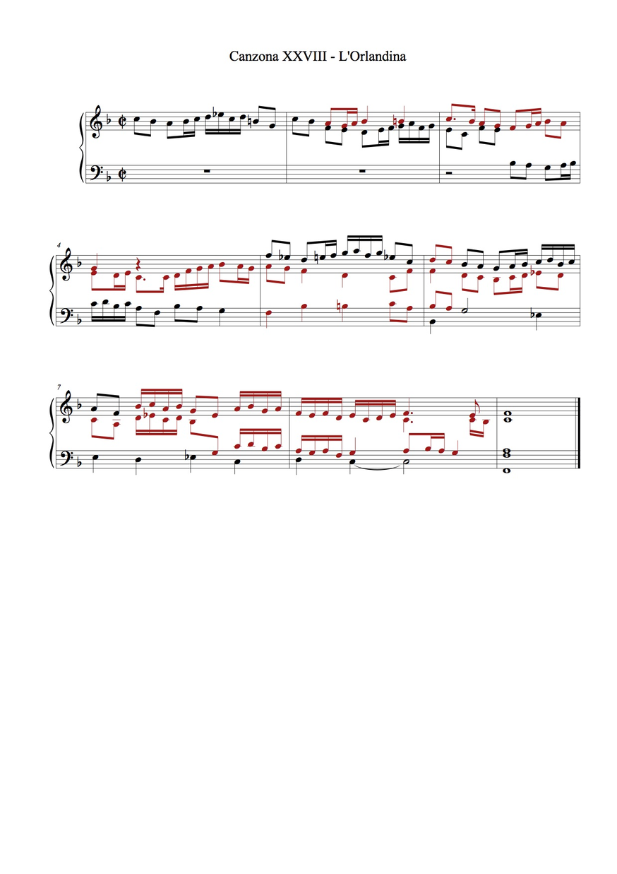 - Canzona: this was the most demanding part, which required writing. I wrote out as an exercise two canzoni of Spiridio reducing them to a “partimento-fugue”, i.e. including only subjects and, where relevant, the lowest voice. The aim was then to complete the missing voices without previously having played the original version. Two versions of the Canzona VI and two of the Canzona XXVIII can be compared in the musical examples 1, 2, 3 and 4 in the following pages (my additions are marked with red ink). In the Canzona VI, Spiridion quotes almost verbatim Frescobaldi (Canzona Prima, Secondo Libro di Toccate, fourth section). Even if I knew the piece and recognised its subject, I did not render the same counterpoint. I did not expect to find fast syncopations (which are common in the volume) or the cadence in the lower octave. On the other hand, the three-voices texture is respected in both versions. The original and “fake” versions of Canzona XXVIII are closer each other, and differences are mostly found in the choice of rhythmical values (as in bar 4).