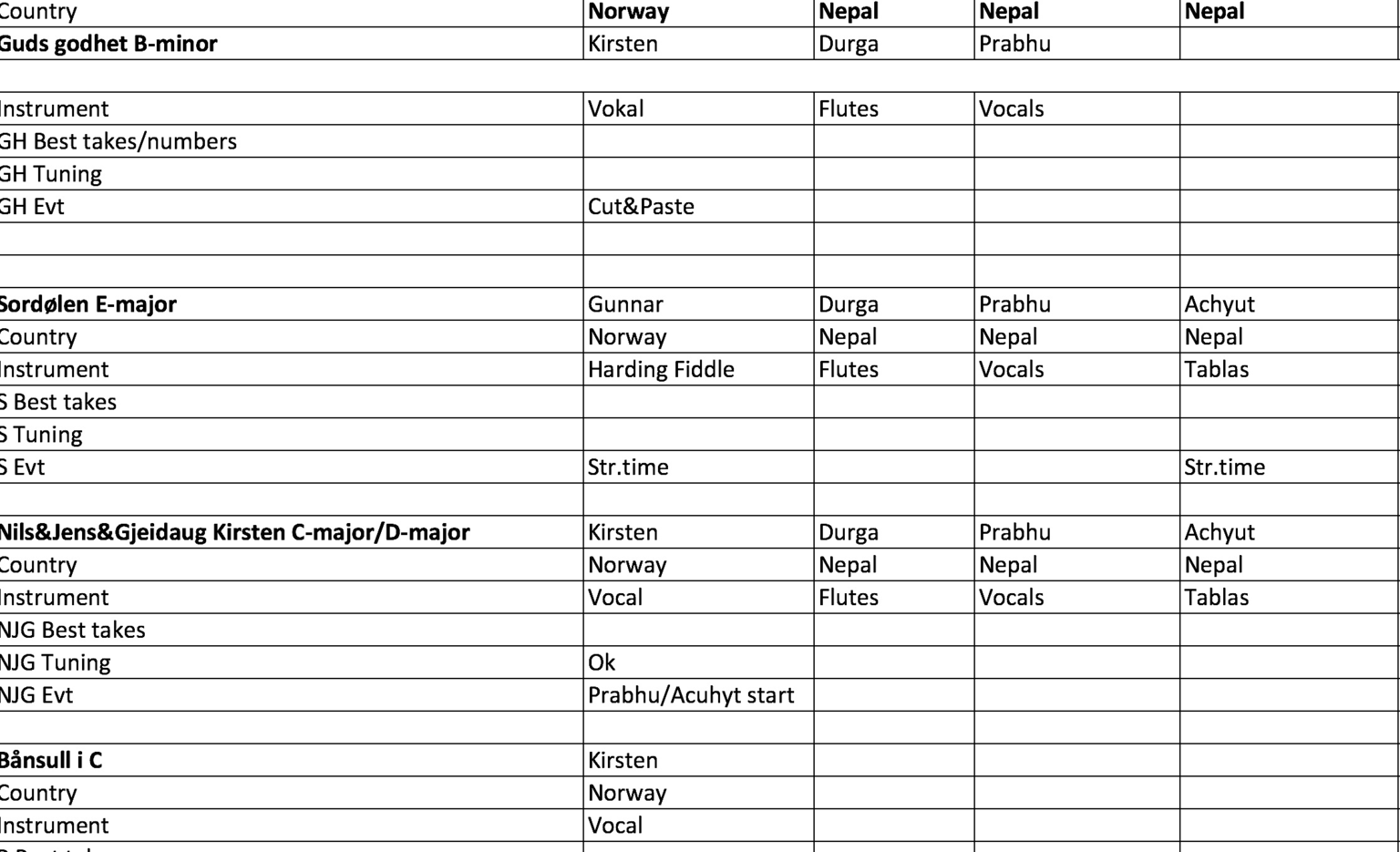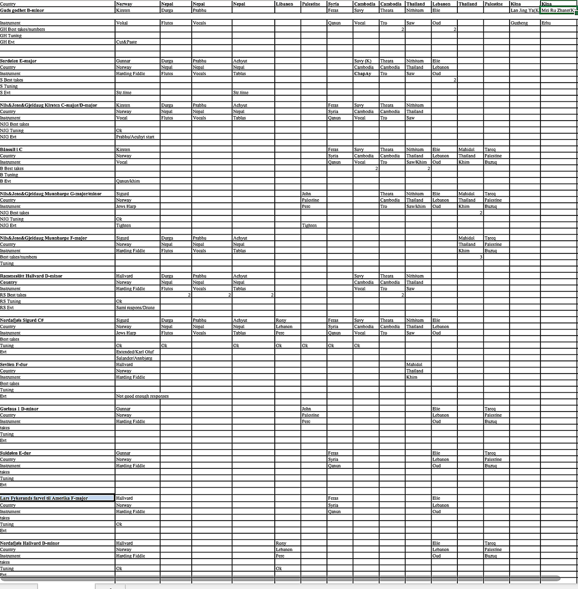 Some of the tunes from each of the norwegian sources were selected based on the criteria of performance and tuning. Haaland travelled for three weeks of field work in this first phase of the project. We did not want to influence the musicians in their approach to the source material: We were looking for unproduced or pure responses. The process was: