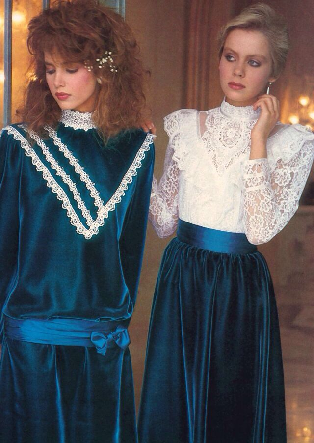 The New Romantic Fashion often referenced historical clothing from 18th and 19th century, such as frilled shirts or frock coats, evoking the elgance of Romantic era. Garmens were crafted from ellegant and luxurious materials like velvet, satin, lace and had embelishments in the form of bows, ruffles and embroidery giving looks a theatrical feeling. The ruffled shirts and elvated tailoring were the reminiscence of Georgian and Victorian era.