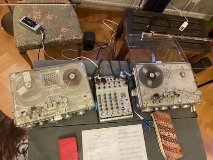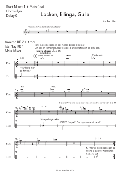 Till sist, några avslutande tankar om de analoga teknikerna som var centrala i Locken, lillinga, Gulla, två rullbandspelare av märket Nagra. Det är som bekant inget nytt att använda rullbandspelare i kompositioner, tvärtom. Tonsättaren Steve Reich som nämnts tidigare skrev sitt första stycke med inslag av talad röst, It’s Gonna Rain 1965 (Boosey & Hawkes 2025), just genom att använda två rullbandspelare. Men samtidigt har de digitala tekniker vi ser som mer nyskapande funnits med så länge att de inte riktigt representerar något nytt längre: CD-utgivning är inte lika aktuellt för en musikers karriär som för bara 10 år sedan, och för många är det utgivning på vinyl som är mer gångbart. Finns det då en särskild poäng med att använda sig av äldre, analog, teknik som rullbandspelare? För min del tycker jag att det tillförde något till mitt musikerskap. För det första var det de flöjtklangliga aspekterna av reverbet, som nämnts i Video 8, där själva ljudmiljön var underbar att spela i och gav en ny känsla av effortlessness. Vidare användes rullbandspelare nr 2 för att spela in fraser av mitt flöjtspel som sedan spelades upp. Härigenom kunde jag gå in utifrån och så att säga manuellt manipulera denna slinga, både med handen och med flöjten (se 5.30 in i filmen från konserten). En av utmaningarna med att spela flöjt är att så många aspekter av flöjtspelet händer inuti kroppen, och det är svårt att verbalisera och styra processerna. Men här fick jag en unik känsla av att kunna styra flöjttonen mer utifrån, som jag skulle vilja experimentera med igen. Till sist brukar jag tänka att gestaltandet av musik egentligen handlar om att styra min och andras upplevelse av tiden. Processen av att arbeta med rullbandspelare, och den långa rullbandslingan som gick runt oss musiker, gav just en slags mycket konkret visualisering av hur tid förlöper. Det kan säkert låta helt obegripligt för en icke-musiker, men som att tid är något generöst, ett förlopp man kan åka med i, och ge rikligt av till den som lyssnar.