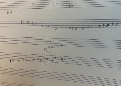 Repetition som koncept har även genomsyrat hela utforskandeprocessen (Video 2) på många plan. Jag menar att detta har bidragit till en djupare förståelse hos mig som interpret för hur repetition fungerar som förstärkande faktor i musikaliska sammanhang. Genom rullbandspelaren uppstår till exempel möjligheten till en form av klanglig repetition – det vill säga reverbet, som inte bara färgade, utan också transformerade min flöjtklang. Att spela partierna med detta rullbandsreverb skapade en känsla av lätthet, en sorts effortlessness (video 3) som kom att prägla mitt flöjtspel. Detta berodde förstås till en viss del på att jag spelade förstärkt, och rent fysiskt inte behövde ta i lika mycket för att fylla salen. Men det handlade också om en ny typ av samspel med mina medmusiker – vid uruppförandet Ida Lundén, och vid konserten på Musikhögskolan Ingesund, Daniel Berg. Det var de som hanterade rullbandspelarna och mixern, och därmed också styrde över den del av ljudbilden som normalt är mitt ansvar: flöjtklangen. I vanliga fall ägnas en stor del av min – och sannolikt många andra flöjtisters – uppmärksamhet åt att kontrollera och forma just klangen. Men i detta fall låg en del av det ansvaret hos någon annan. Det frigjorde min uppmärksamhet och gjorde det möjligt för mig att fokusera mer på att lyssna in och imitera Karin Turessons röst, och att spela i dialog med det mjuka, efterklangsrika ljudlandskapet. Jag märkte också att jag ibland fick en annan ingång till vissa flöjttekniska aspekter. Samlingsnamnet för nutida speltekniker på flöjt är extended techniques, alltså något som går utöver det vanliga. I annan nutida repertoar har jag ofta upplevt att det är problematiskt att både hitta rätt grepp för kvartstonerna – alltså fingersättningen – och rätt intonation. Men nu, i imitationen av Karins melodiska nedåtgående rörelser med kvartstoner, kändes dessa plötsligt helt naturliga och sångbara.