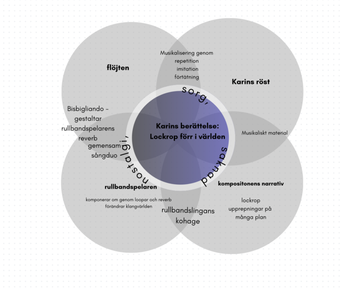 Min upplevelse är att formandet av dessa regler som skulle få styra det kommande verket var något helt centralt under hela processen. Intressant nog var det nog bara punkten om att ”det är analogt” som vi verkligen tog fasta på. Det var inte förrän i samband med mina analyser av videodokumentationen som jag märkte att stycket visst hade kommit att handla mer om sorg än om humor. Men ändå hade jag hela tiden känslan av att vi följde reglerna vi satt upp? Inslagen av sorg, saknad och nostalgi, fanns inbyggda redan i Karins berättelse, som handlade om ”hur det var i forna tider”, som hon sade på inspelningen 1958. Denna nostalgi över något som gått förlorat blev än mer förstärkt och repeterad nu, när vi i vår tur såg tillbaka på tiden runt arkivinspelningen. Så även om inte Ida och jag märkte det, var det som att den krävde sin rätt att få genomsyra kompositionen. För att summera, var det just sorg, saknad och nostalgi som fanns i de reflektionsrum som öppnade sig i dessa specifika mellanrum, mellan språket och musiken. Vidare gavs analysen av hur de olika källorna i det färdiga musikaliska verket relaterar till varandra en grafisk modell , som kan ses här.