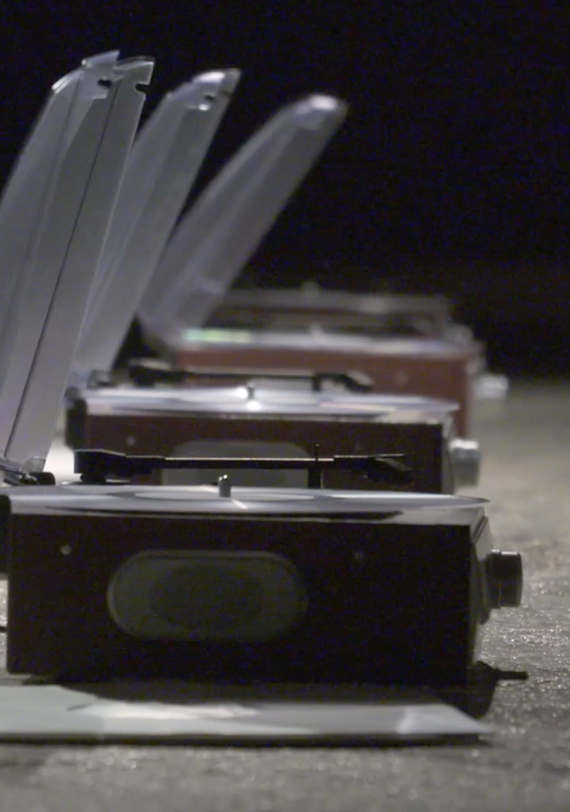 Slowly, they begin to play vinyl records and operate the 16 turntables.They move and communicate quietly, listening to each other through the turntable field, watching each other’s actions. They pause, move again, and react ‘musically.’
