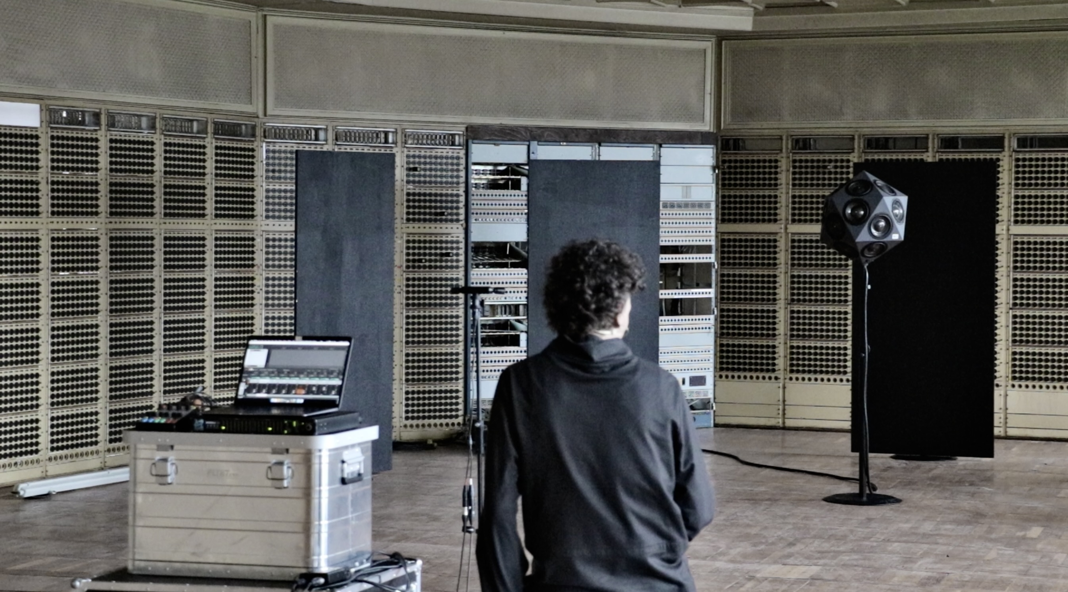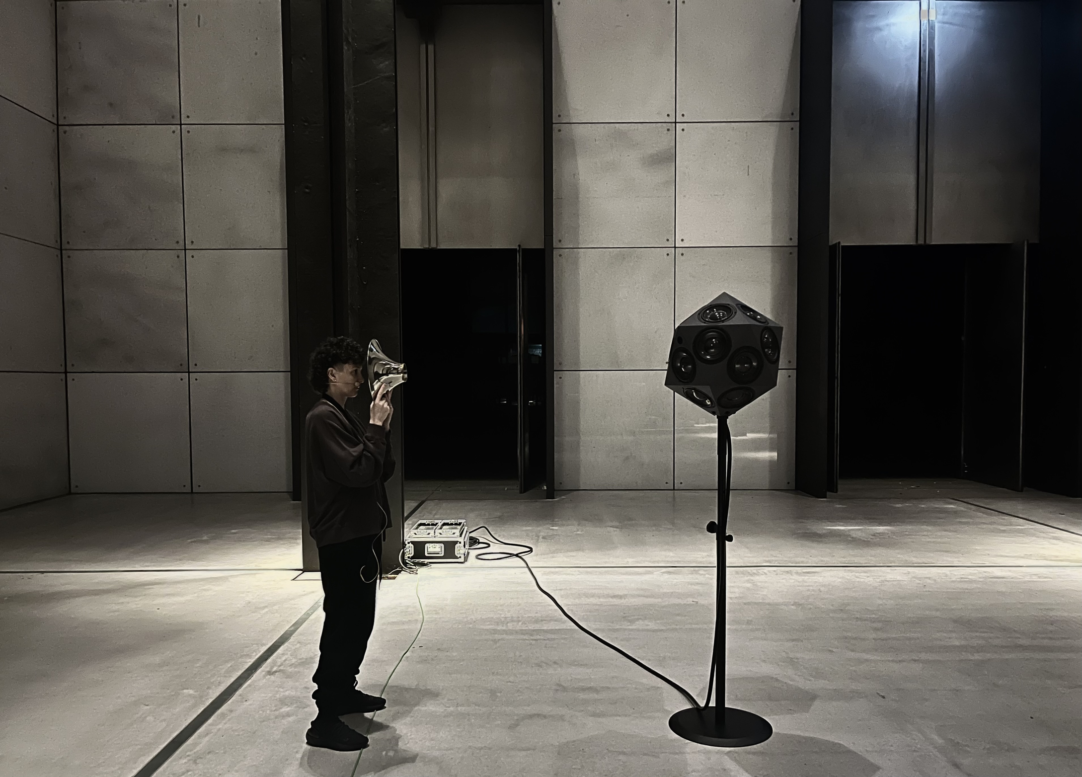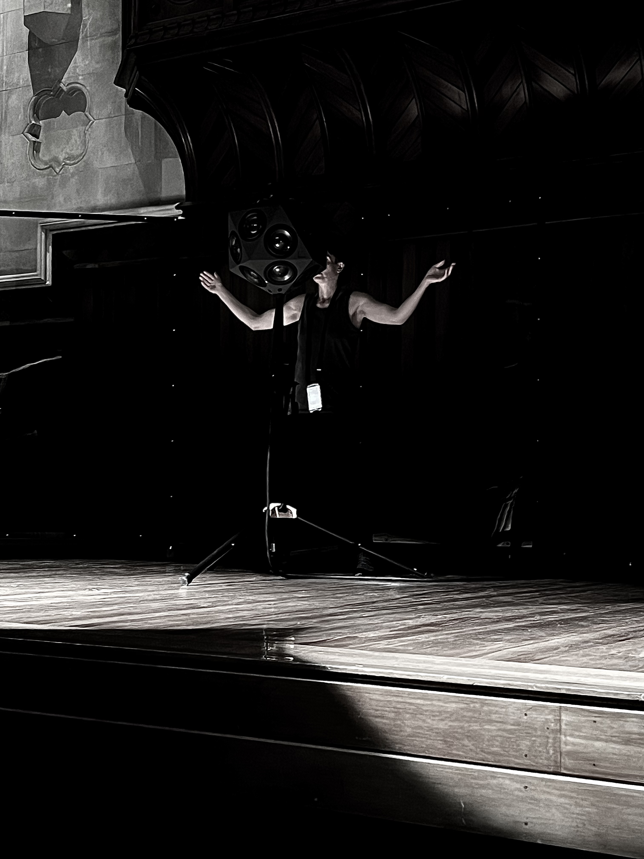 The spatialised sonic textures are picked up by the omnidirectional headset and played back through the IKO once again. This feedback loop between my voice, the sound beaming, and the space becomes a crucial element, with the space itself participating in the performance as a resonant body that shapes the vocal performance.