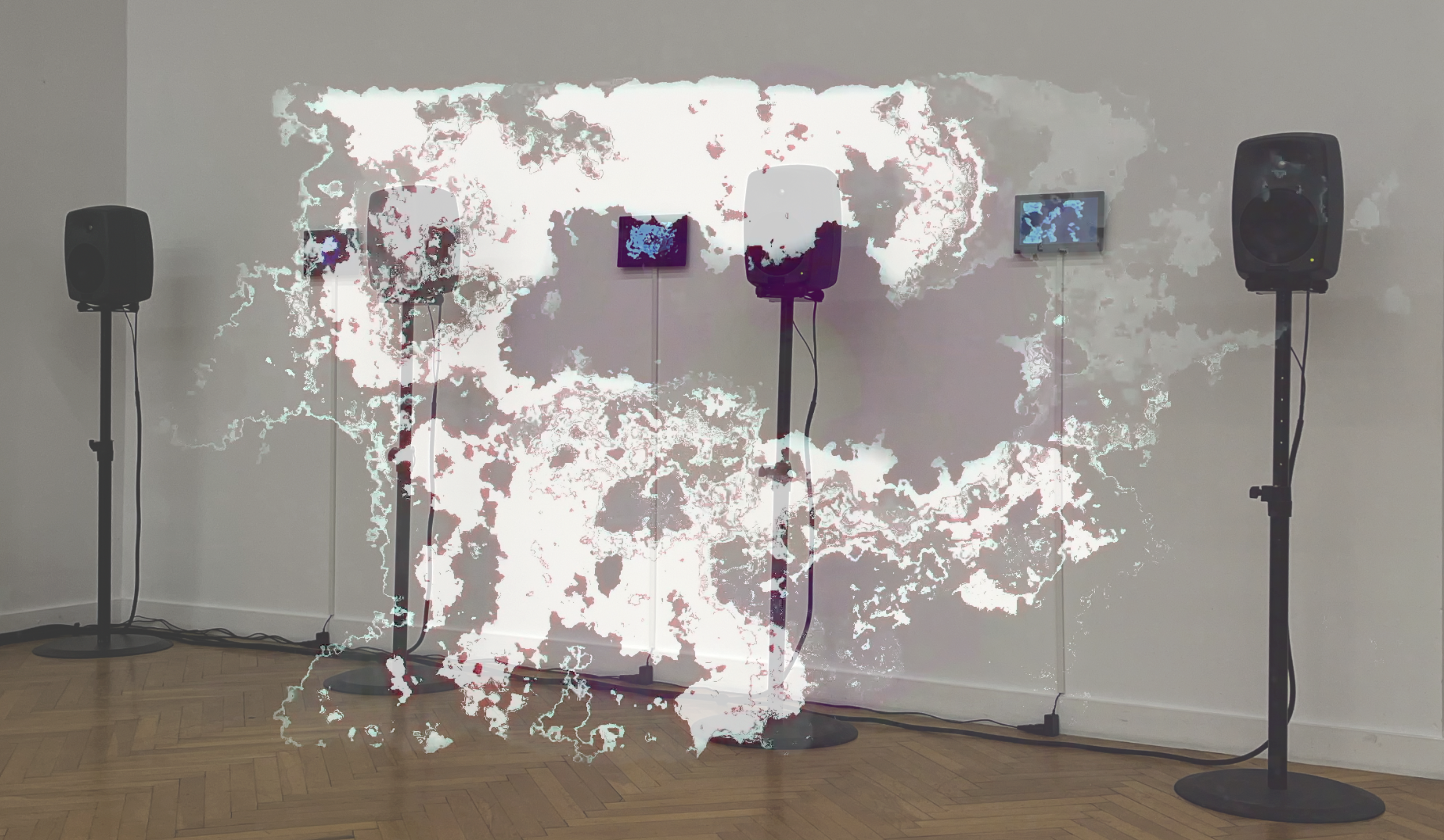 In this sound installation, the human voice merges with an artificially generated voice, interacting in a way that deconstructs linguistic phonemes.