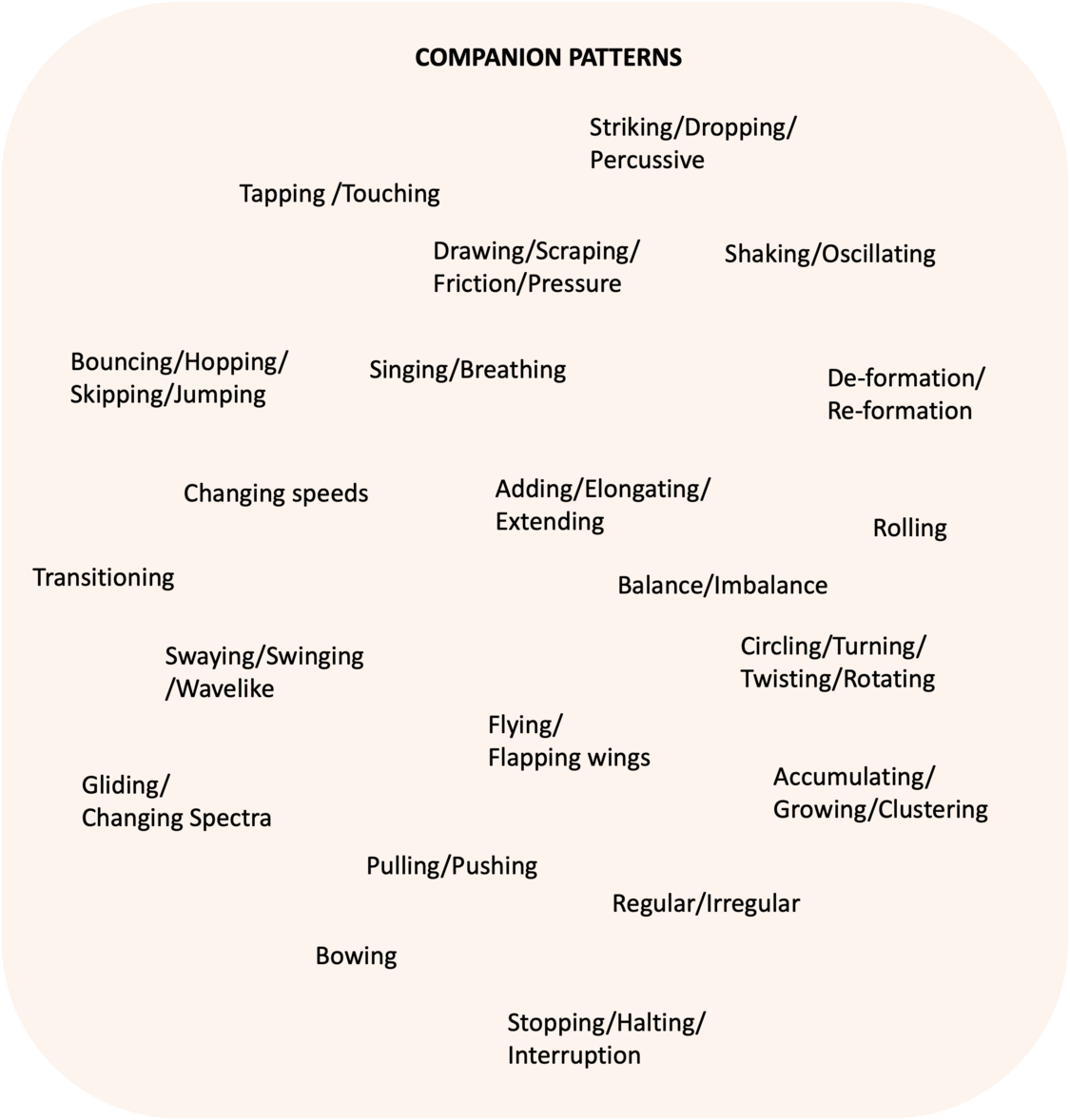 Can a series of movement patterns—emerging from the acts of companions, including blackbirds, magnets, lichens, our movements within Palazzo Russo alongside companion researchers, and the gestures of fellow researchers engaged in practices such as printmaking, transforming, tracing, organizing, and materializing—be identified and articulated as a shared vocabulary? Could these recurring patterns become a shared language, linked to sonic, physical, and visual elements, that helps us describe and guide how we listen and create?