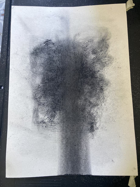 Elena is currently interested in explorations with graphite, and lichens. As we shared our individual processes with each other, we became curious about the possibility of combining our explorations; wondering if magnetic relationships could be explored through graphite. Our shared inquiry included different forms of movement, visual traces, and sound, drawing inspiration from organisms such as lichens and imagining movements, visuals and sounds they might produce or embody. In our experiments, we found that magnets had a slight effect on the fine specks of graphite and the powder versions, but not on the pebbled forms. This led us to incorporate pieces of metal wire (which I’ve been working with) into the graphite mixture.