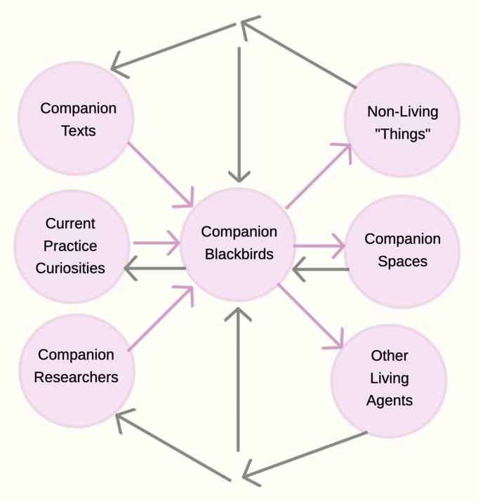 Throughout, my processes are informed and shaped by companion collaborators—human (research-creation companions), more-than-human, textual, and material—who co-inform and co-create the unfolding of the research.