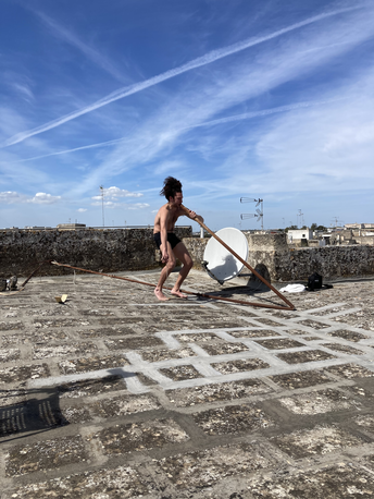 The residency in Lecce, marked as the intensive period of the residency, had a high level of relational contingency. All participants resided within the same palazzo, engaging in a multitude of communal activities that facilitated continuous interaction. These activities included daily discussion meetings, movement exercises, "village" exercises offered by facilitator Susanne Bosch, communal cooking, social events aimed at connecting with the local community, exploratory trips, soft invitations (visiting each other’s work), shared meals, work breaks, and the use of communal working and living spaces. Such a dynamic environment created numerous intertwined points of synchronization. Such high-level contingency asks for a highly mindful artistic process, which required a heightened level of listening, reflecting, responding, affectability, fragility, and care. The complexity of the co-operating required to rely more on my listening in moving-with others. Listening-with and -through the density of movement, of thinking, of presences, asked from me to work on my speed of perception and processing. With eight people living and working in close proximity, all actions influenced each other’s creative practices. And consequently, one thing that immediately rose to the surface was the significance of nearness, the role of repeated actions in shaping listening, sounding, and moving bodies.