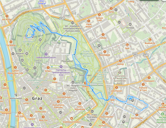 I began a daily, repetitive walk along the same route—between Reagenz and Schlossberg—passing through Stadtpark and ascending to the top of Schlossberg hill, where I frequently encountered blackbirds. My movement along this recurring path helped orient my awareness to the first space of the residency and facilitated tuning into its specific spatial and acoustic properties.