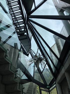 We spent three days at the Steinhaus. During this time, I listened to the space, wandering in its metal and sharp, neat architecture, remaining receptive to the impressions and effects it awakened. Ultimately, I chose to incorporate the metal plates I had brought from Graz, as they resonated with the space’s material, color, shape and form, establishing a dialog between the two.I began to connect the plates with wires to the memory capsule objects I have been collecting from various spaces. By attaching a transducer speaker to the plates, my intention was to allow the movements of sound to influence the networked web of metal wires, linked to the memory capsules. In doing so, the sound would play through and with the metal plate, the metal wires and the memory capsule objects. The video excerpt provided demonstrates a prototype of this concept.
