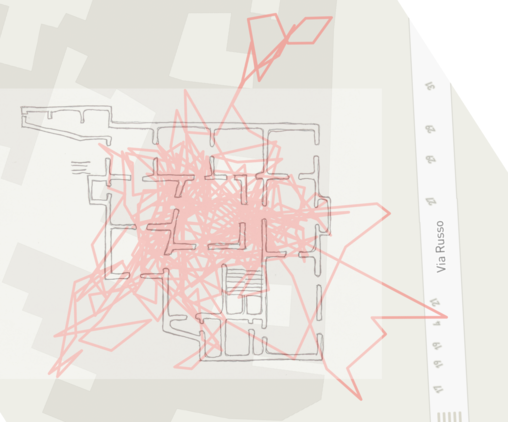 Although I do not go for repetitive walks outside the house every day as I did in Graz, I find myself still performing repetitive movements within the structures of the house. In an attempt to capture these movements, I decided to record them. However, perhaps due to the thickness of the walls, the GPS tracker failed to provide an accurate representation of my movements. I did not visit any of the top three rooms on the right, and there were movements outside the house as well. Despite the inaccuracies, this remains the closest approximation I could achieve in comparing Franziska’s map with my movements. Who knows, perhaps some of these traces belong to Gertrude, one of the ghosts of the previous owners of the palazzo.