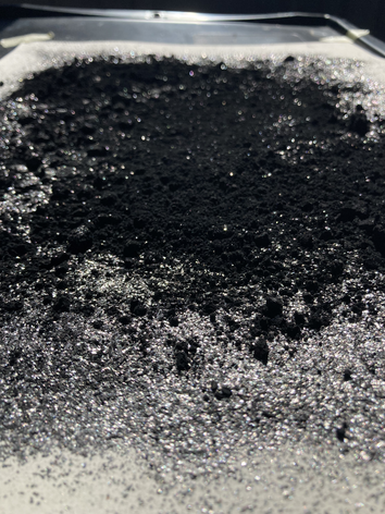 Elena is currently interested in explorations with graphite, and lichens. As we shared our individual processes with each other, we became curious about the possibility of combining our explorations; wondering if magnetic relationships could be explored through graphite. Our shared inquiry included different forms of movement, visual traces, and sound, drawing inspiration from organisms such as lichens and imagining movements, visuals and sounds they might produce or embody. In our experiments, we found that magnets had a slight effect on the fine specks of graphite and the powder versions, but not on the pebbled forms. This led us to incorporate pieces of metal wire (which I’ve been working with) into the graphite mixture.