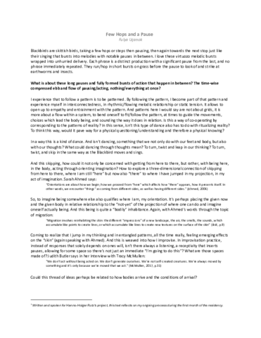 The work blends electroacoustic composition with the audio paper form, inviting listeners into a reflective space as it explores the complex (im)possibilities and (mis)understandings that emerge when sounding nearby another voice; in this case the voices of blackbirds.