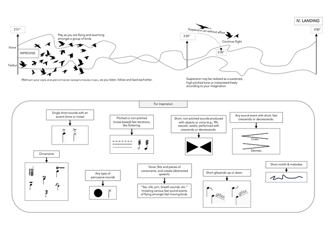 A central inquiry of the work is: how might each agent—the blackbird, the soprano, the tanbur, and their respective sounding bodies—speak in their own voices while also sounding within a space that speaks with and through all voices? The social imaginary of the piece is interested in recognizing and overthrowing fantasies of single-centered, one-way control systems, and to explore spaces for heterarchical relationships. Here, power moves and shifts, sometimes singular and at other times shared or multiple, but always in flux. The goal is to create a sonic-habitat where no single-voice has constant accumulation of power over the other. How might we become sounding habitats for one another? How do we sound nearby each other? This exploration holds both the (im)possibilities and (mis)understandings that arise in the act of sounding together. Framed within an interpretative and comprovisatory approach, the work values immediacy, responsiveness, and the emergence of sonic gestures within contingent time-space relations. Performers are invited to ask: Performers are invited to explore: What may I offer? How can I support the others in the socio-sonic habitat as I travel with them sonically?