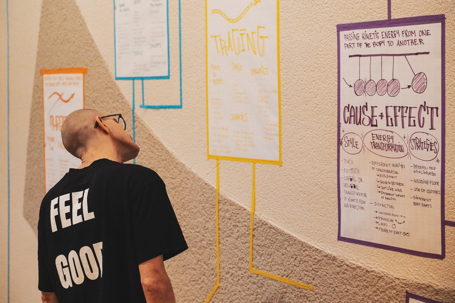 Concerning the inquiry of the choreographic potentiality of this material, there are two major approaches. Firstly, the reflection of carried out one-on-one sessions (one dancer improvising, one spectator observing) and its documentation on notation sheets. This aims to create a spectrum of insights about what an audience perceives or makes of the movement when seeing cross-style principles in a more or less raw form of motion or performance. As an extension to this line of inquiry, the creation of a solo piece named good for you provides experience on how to apply or use these findings within an artistic process – and additionally through the upcoming live performance.