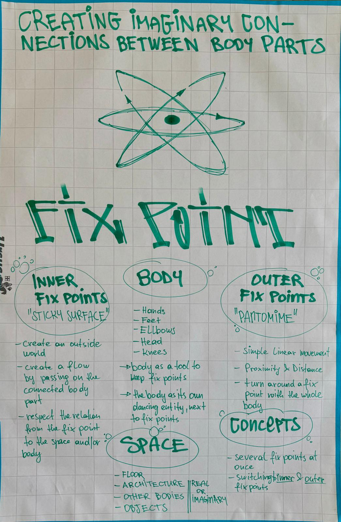 My research also draws on methodologies from classical and contemporary fields that explore movement analysis and documentation. William Forsythe’s "Improvisation Technologies," provides insights, tools and methods of visualizing and articulating movement. The Motion Bank project extends this exploration by analyzing choreographic processes and in the course provides a platform for understanding movement through digital visualization. Similarly, Laban’s movement analysis presents a comprehensive framework for observing and describing movement in a general way, focusing on aspects like body, effort, shape, and space.Particularly their approaches to movement through a lens of geometry and topology helped methodizing the cross-style principles. Although I haven't engaged with these systems as deeply as I aimed for, they inspired me to acknowledge the importance of developing concepts and languages to describe, transmit, and evolve movement practices. Nevertheless, I feel that Treasure Flow emphasizes the facilitation of movement emergence more through community-based exploration and lived experiences of exchange and co-creation.