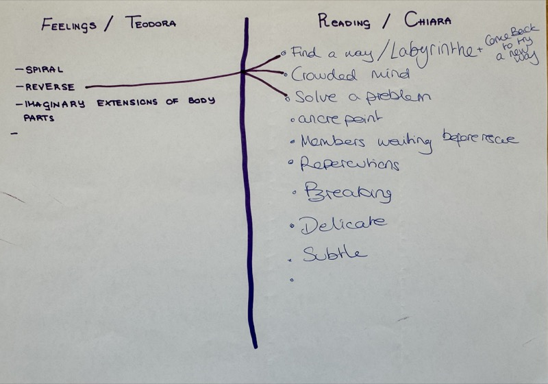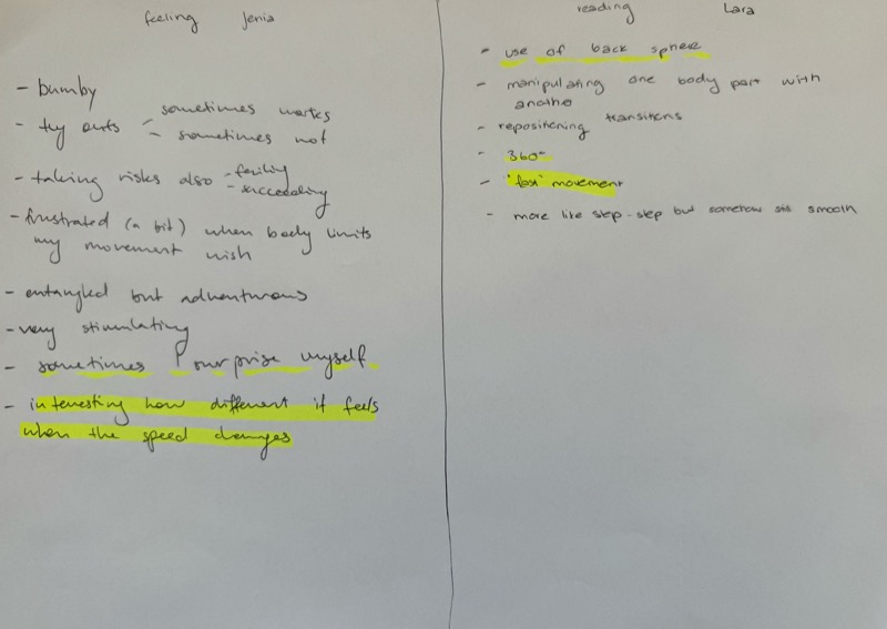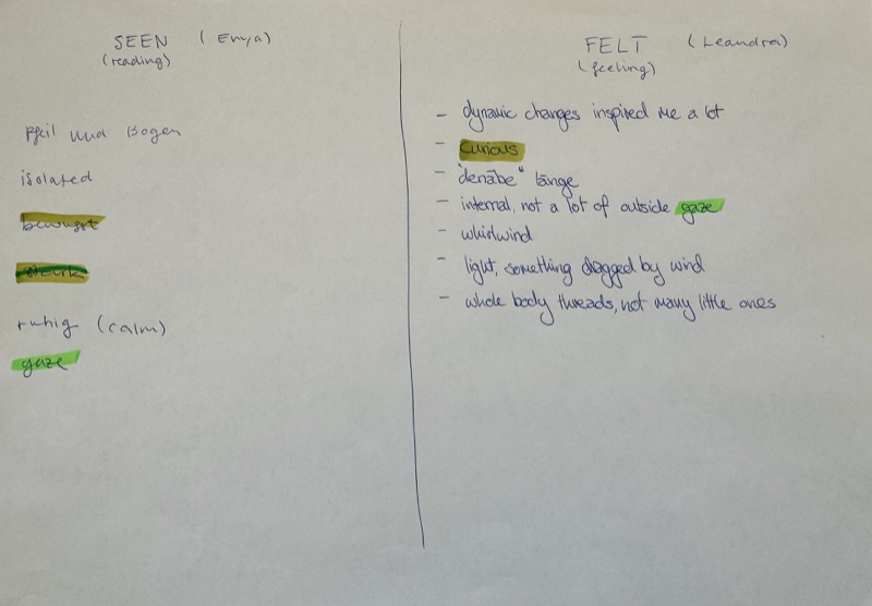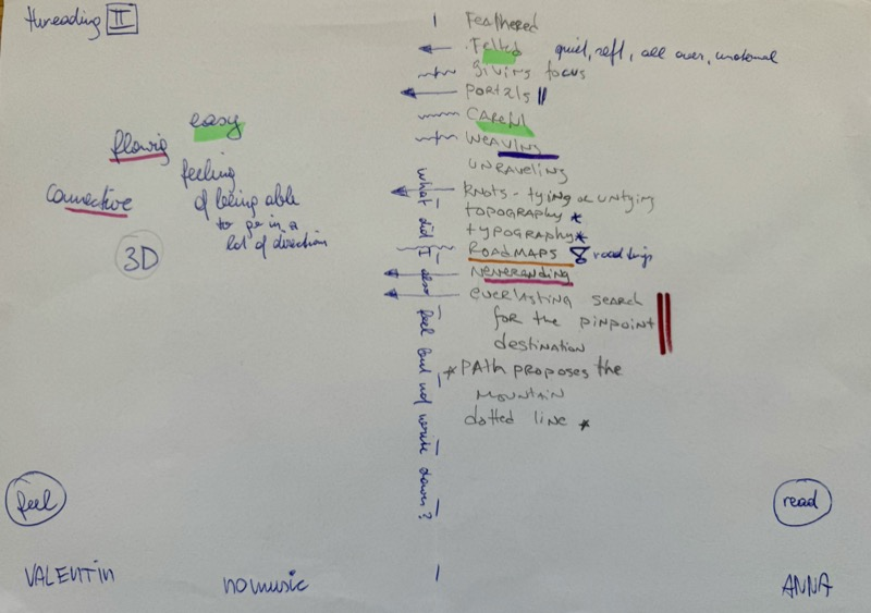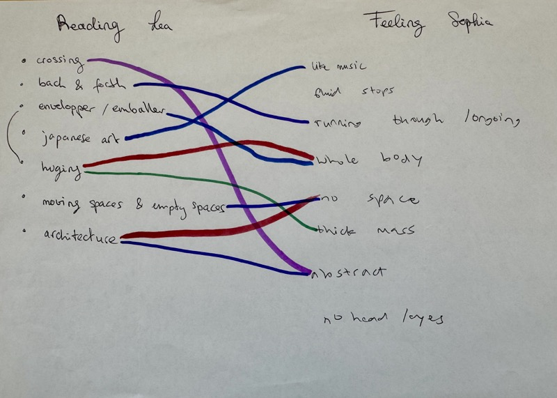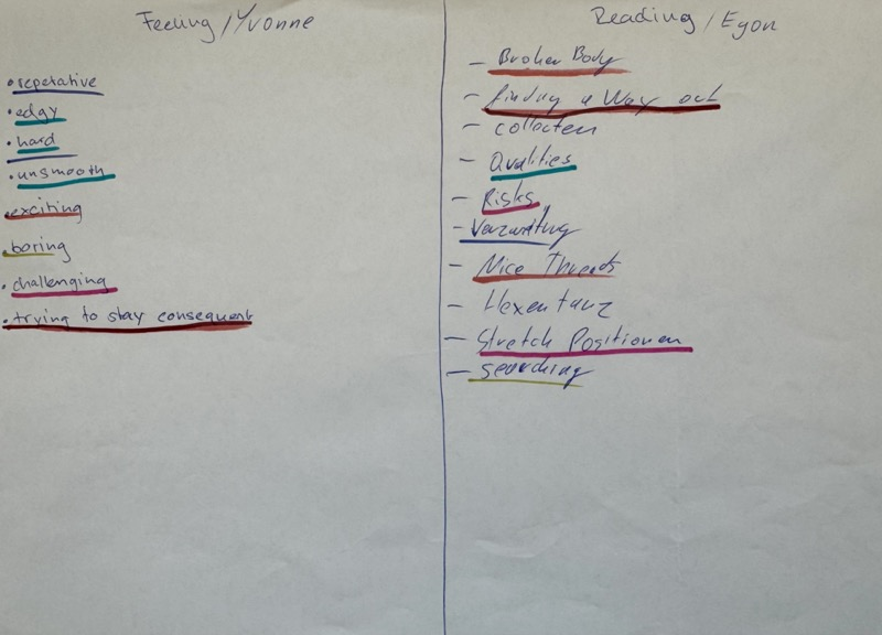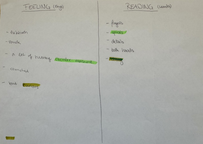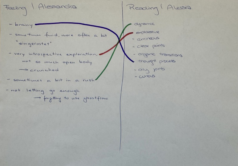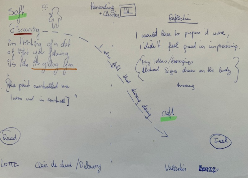 A significant number of the notations or drawings emphasize connection, both internal (within the body) and external (to the environment or the audience). Words like “connecting”, “flow”, “ties”, “weaving”, “floating” and “threads” appear frequently, suggesting that the dancers are often exploring how to link parts of their body, their movements, or even relations to spaces and energies. At times, these connections are referred to in a more complex or abstract way, such as “reaching” and“unravelling” indicating a more tentative approach to movement.Words such as “exploring”, “searching” and “discovery” recur across several of the notation sheets. This speaks to the phenomenon that dancers and spectators alike are taken on a journey of constant investigation. Cross-style principles applied in dance seems to be felt as an unfolding process, revealing sensations of newness or fresh perspectives at different moments.At times the qualities develop to a point, where the creating aspect and the doing aspect blend and dancers, as well as spectators, noted words like “being guided”“roadmap” or “following”. Many dancers noted flow, fluidity, smoothness, and circles(e.g., “fluid stops”, “spirals circulate”, “mountain landscape”). To my interpretation, it is a significant aspect on how experienced you are in engaging with cross-style principles in order to reach this flow, hence the name Treasure Flow. Mentioned objects like “knots,” “puzzles,” “threads,” and “maps” evoke a sense of structure and problem-solving within the engagement and improvisation, indicating that even within the flow, moments of meaning, purposeful construction or strategy can arrive.Some of the sensations of being “blocked”, “restricted”, or “disconnected” that emerged during the improvisation may arise from the demands of the task of following cross-style principles. For many dancers, these moments appear when their experience is still forming, or when they are navigating new methods of moving itself– trying to incorporate a newly created pattern into their improvisation for example.
