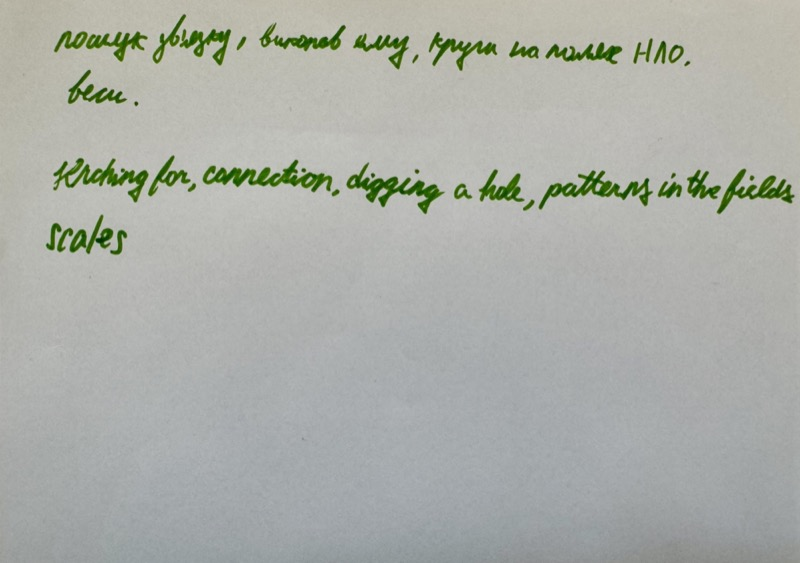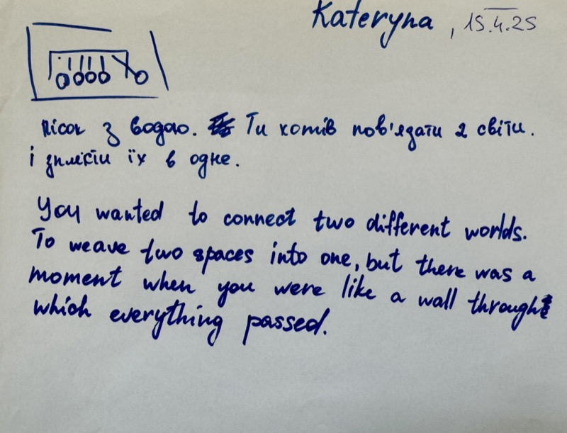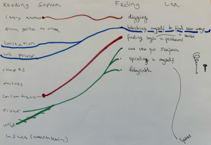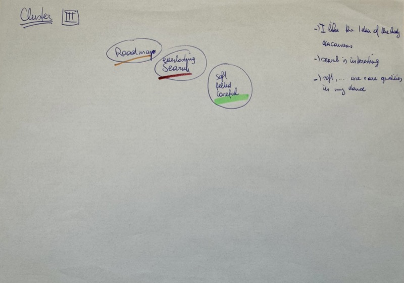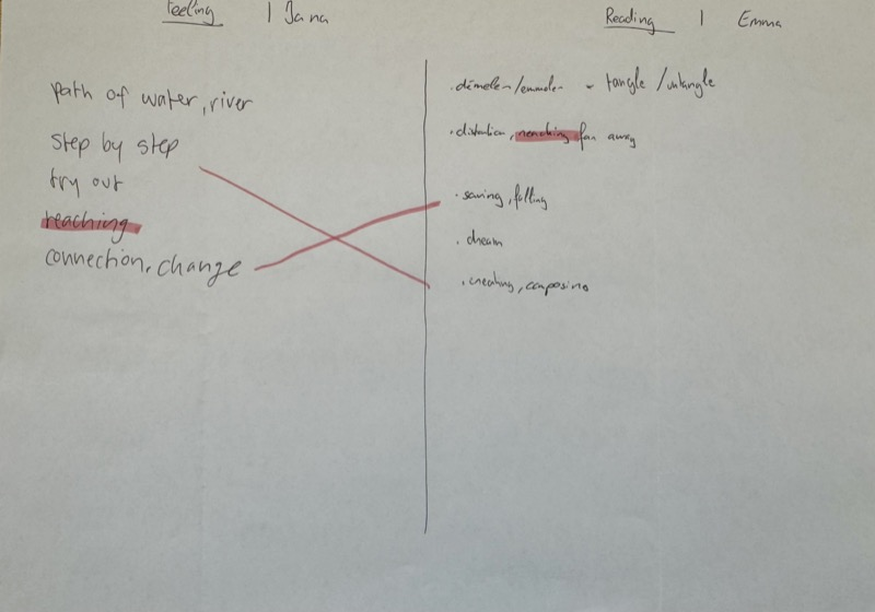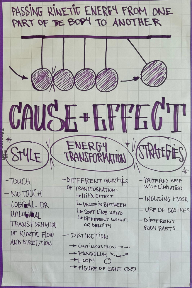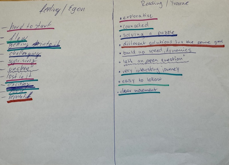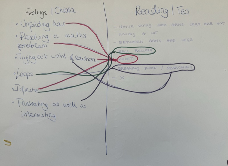 A significant number of the notations or drawings emphasize connection, both internal (within the body) and external (to the environment or the audience). Words like “connecting”, “flow”, “ties”, “weaving”, “floating” and “threads” appear frequently, suggesting that the dancers are often exploring how to link parts of their body, their movements, or even relations to spaces and energies. At times, these connections are referred to in a more complex or abstract way, such as “reaching” and“unravelling” indicating a more tentative approach to movement.Words such as “exploring”, “searching” and “discovery” recur across several of the notation sheets. This speaks to the phenomenon that dancers and spectators alike are taken on a journey of constant investigation. Cross-style principles applied in dance seems to be felt as an unfolding process, revealing sensations of newness or fresh perspectives at different moments.At times the qualities develop to a point, where the creating aspect and the doing aspect blend and dancers, as well as spectators, noted words like “being guided”“roadmap” or “following”. Many dancers noted flow, fluidity, smoothness, and circles(e.g., “fluid stops”, “spirals circulate”, “mountain landscape”). To my interpretation, it is a significant aspect on how experienced you are in engaging with cross-style principles in order to reach this flow, hence the name Treasure Flow. Mentioned objects like “knots,” “puzzles,” “threads,” and “maps” evoke a sense of structure and problem-solving within the engagement and improvisation, indicating that even within the flow, moments of meaning, purposeful construction or strategy can arrive.Some of the sensations of being “blocked”, “restricted”, or “disconnected” that emerged during the improvisation may arise from the demands of the task of following cross-style principles. For many dancers, these moments appear when their experience is still forming, or when they are navigating new methods of moving itself– trying to incorporate a newly created pattern into their improvisation for example.