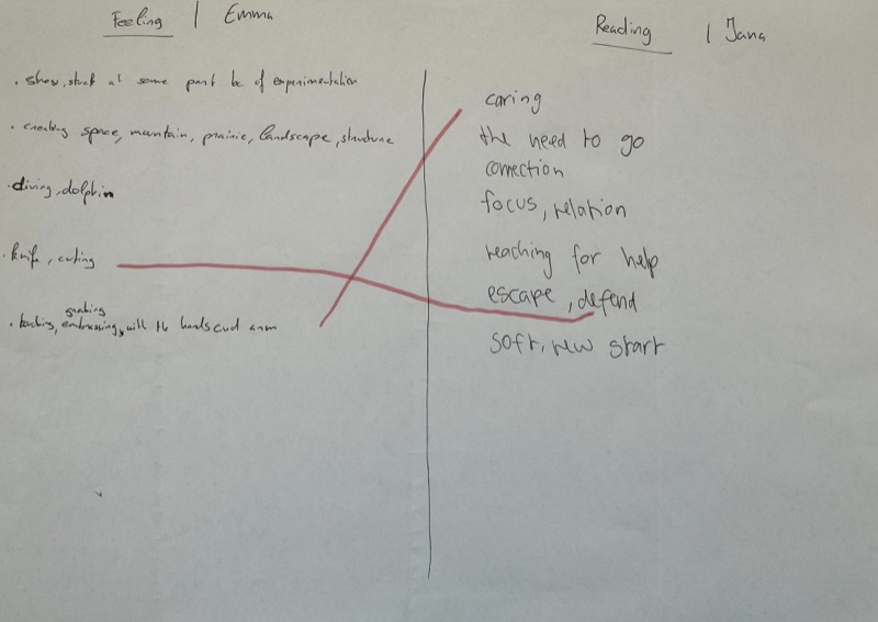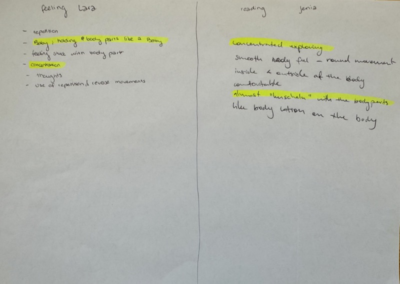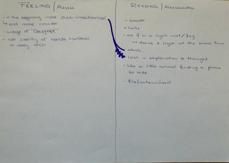 - Several notations contain oppositional or contrasting imagery. For example, some dancers feel fluid and smooth, while others describe themselves as crunched, restricted, or blocked. There is also the tension between internal connection and external presentation, as seen in how some dancers describe the feeling of their body (e.g., “blocked,” “tight”) compared to how the spectator perceives it (e.g., “smooth,” “flowing”). This tension between internal experience and external interpretation may indicate moments of frustration or misalignment during the improvisation, where dancers struggle to reconcile their body’s feeling with the message they wish to communicate.