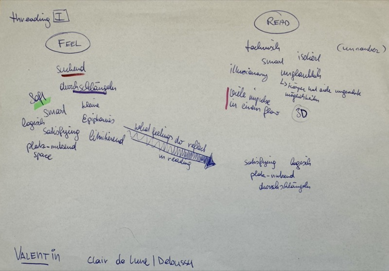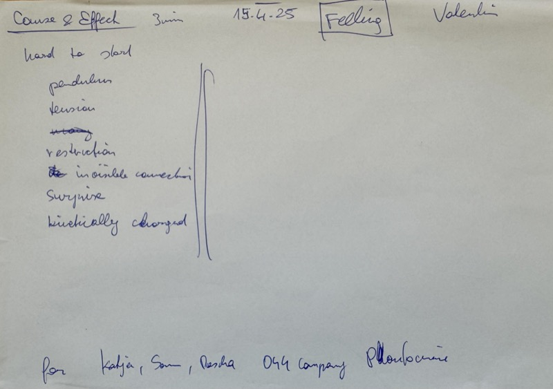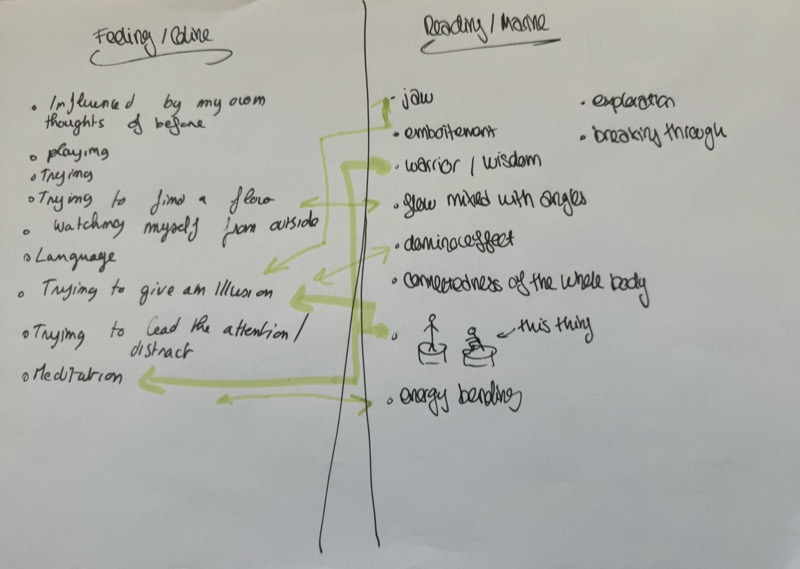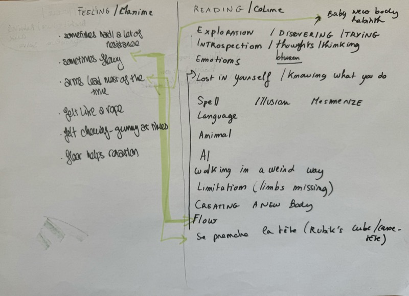 - A significant number of the notations emphasize connection, both internal (within the body) and external (to the environment or the audience). Words like “connecting,” “flow,” “ties,” “weaving,” and “threads” appear frequently, suggesting that the dancers are often exploring how to link parts of their body, their movements, or even different spaces and energies. At times, these connections are more complex or abstract, such as “reaching,” “searching,” and “unraveling,” indicating a more exploratory approach to movement.