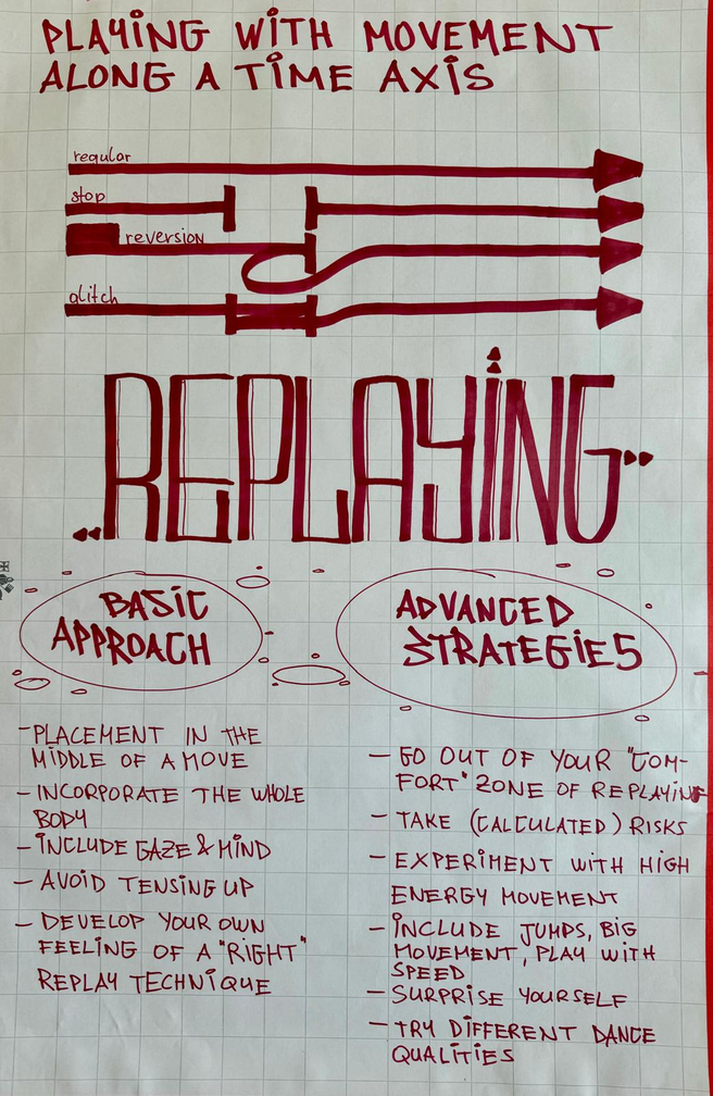The terms of “replaying” and “repositioning” are coined by myself over the course of this research – as the movement is omnipresent, but without a common terminology that I know of yet. Additionally, the name of “cross-style principles” is my own descriptive term, that helps to facilitate a mutual understanding in conversations.Together – the already existing as well as the self-created terminology forms the theoretical framework of Treasure Flow.